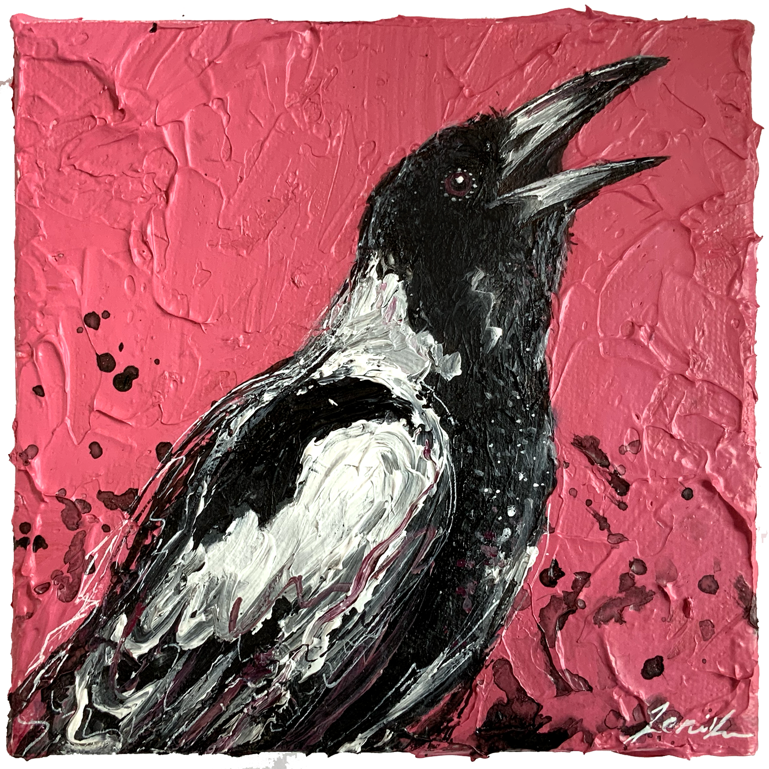 A beautiful small painting of an Australian Magpie, by Sydney artist Leni Kae from her “Animal Spirit” series. Created on stretched canvas, ready to hang (approx 15.5 x 15.5cm with 3.5cm depth). Lovely textured artwork featuring thick impasto.