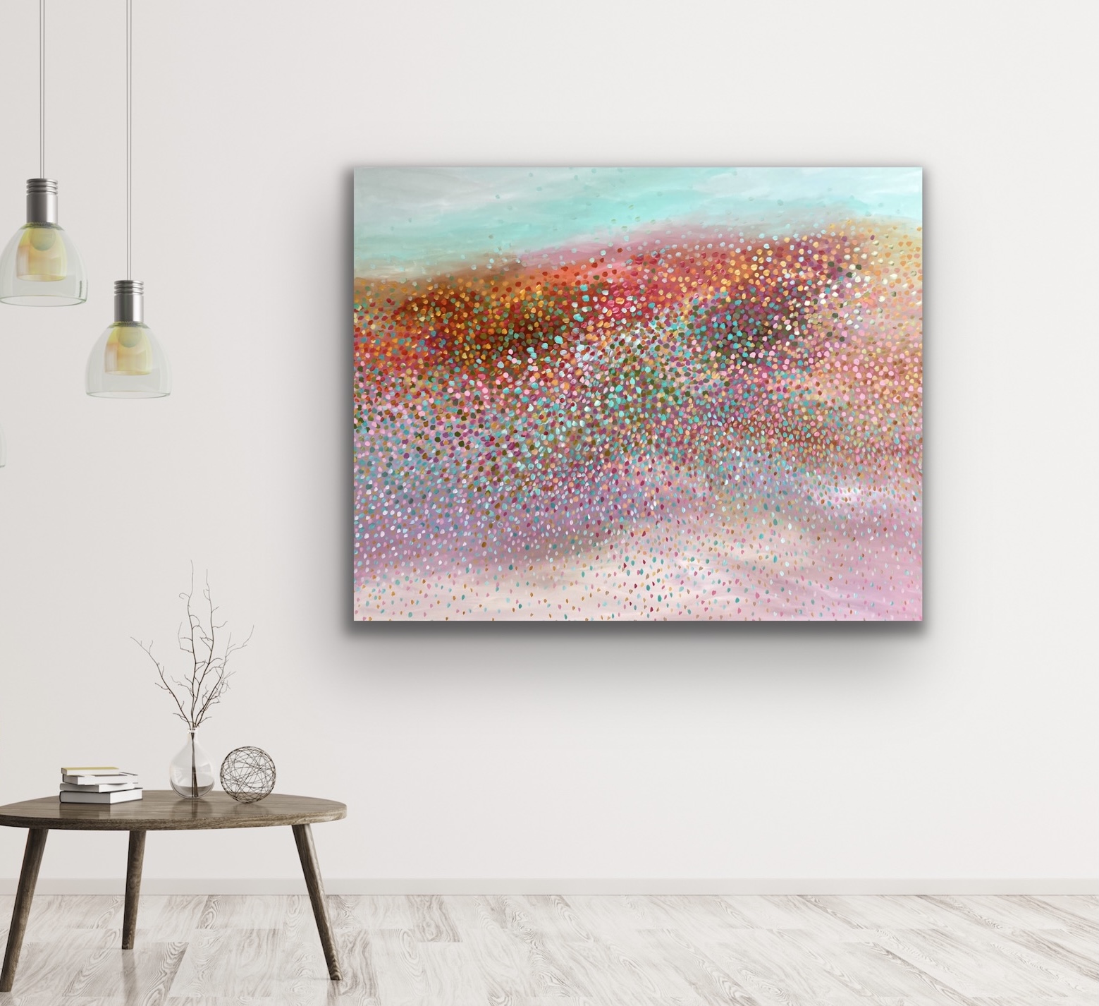 Majestic by Theo Papathomas is a very soothing and tranquil painting where sky, clouds, sun, and petals come together to create this beautiful harmonious landscape. Capturing the beautiful colours of the petals falling from the sky onto the landscape like a veil covering the whole hill with the rays of the sun falling onto the petals . I tried to create so much depth in the painting. A very harmonious and tranquil composition that can be enjoyed many years to come. The painting is signed and dated 2020 at the back and comes with a certificate of Authenticity.