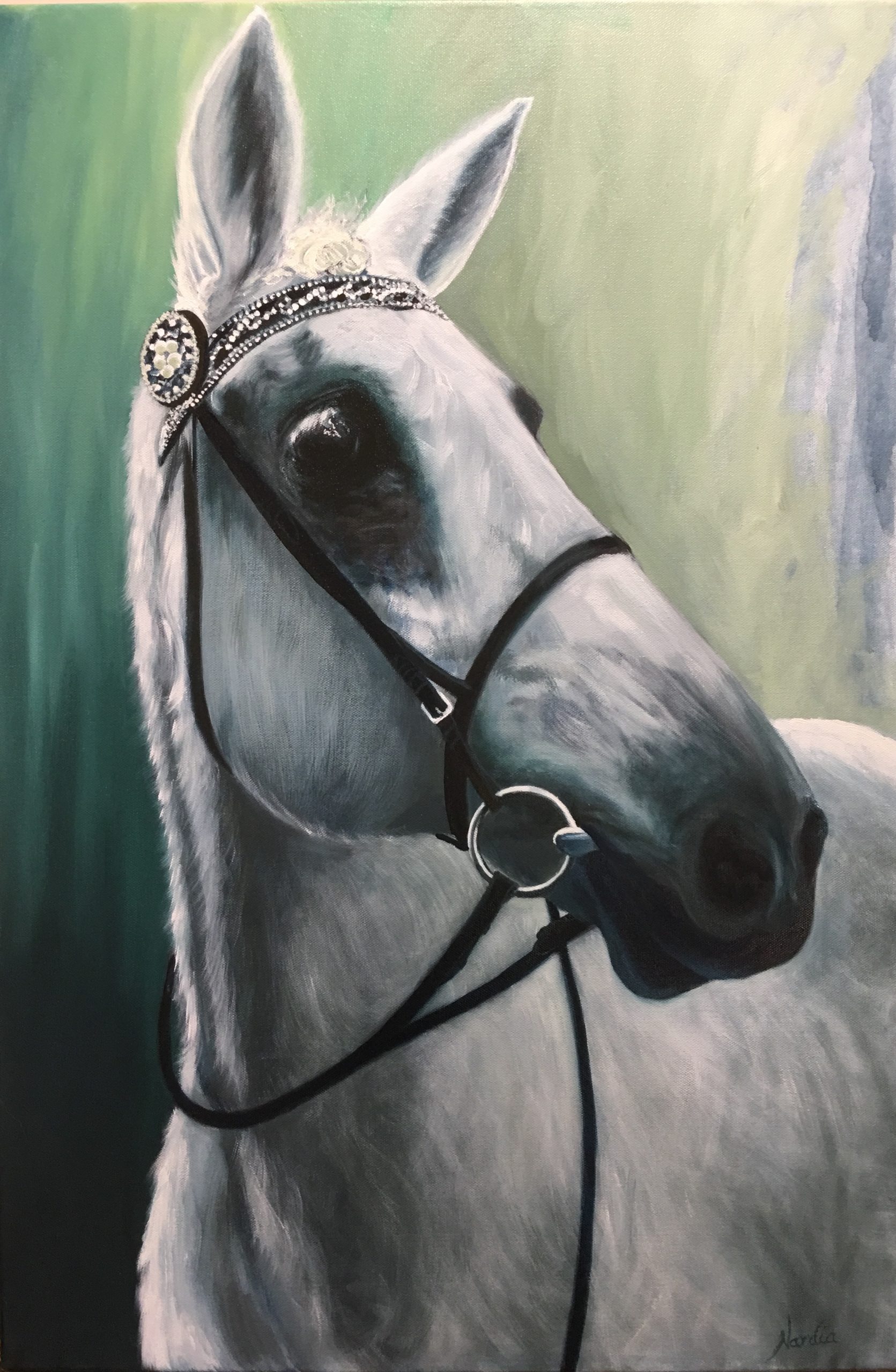 Majestic By Nardia Tonna. I saw this beauty while attending the Ekka. I love grey horses and I thought she looked particularly majestic in all her show finery. I used an acrylic wash for the background and oil paints to finish her beautiful coat. I wanted to capture her beauty, grace and magnificence on a canvas in a soft gentle manner just as she is.