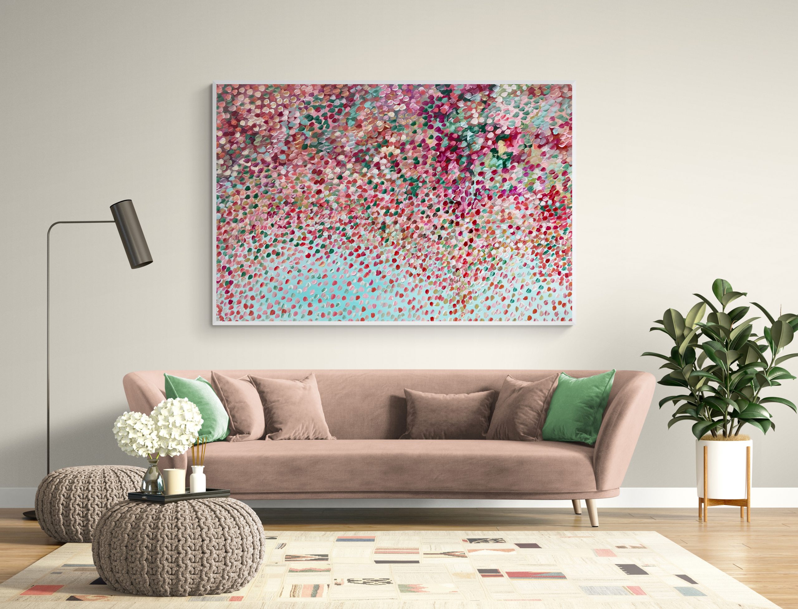 Majestic Beauty by Theo Papathomas –  a painting with warm and cool colours of the petals flying in the wind creating this beautiful bouquet of petals in the sky with lots of layers of paint and texture. Flickering petals dancing in the sky like shining stars creating beautiful rhythms in the Sky . Petals weeping onto the landscape creating this veil of petals covering the sky with lots of layers of pastel colours . A composition of colours and rhythms of petals dancing like musical notes creating fireworks in the sky . A very peaceful and tranquil painting with so much depth. The painting does not come with an external frame.The painting is signed and dated 2022 at the back and comes with a certificate of Authenticity.