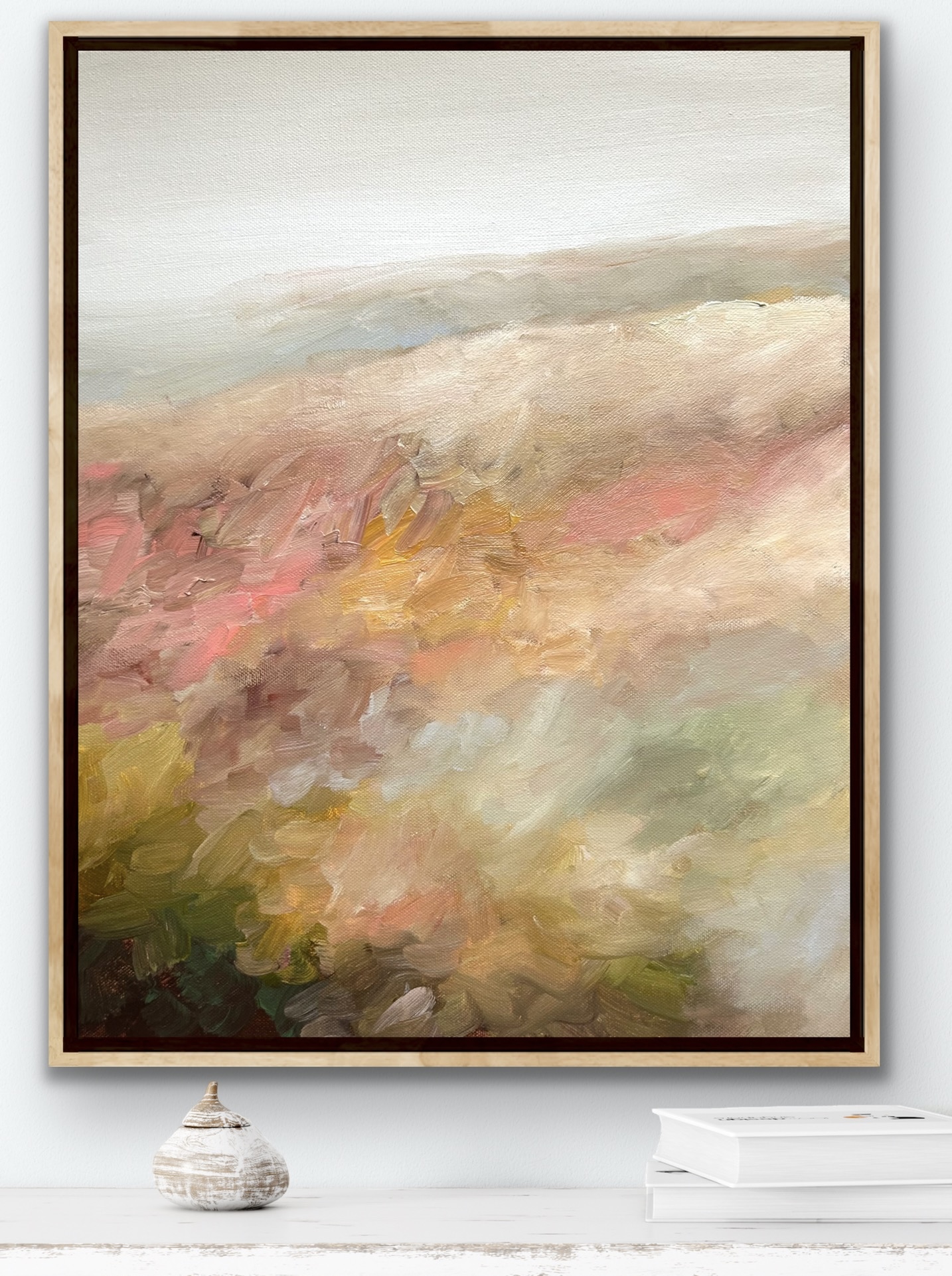 Majestic Morning by Theo Papathomas  a painting celebrating colour and light of the Australian landscape. A very soothing and tranquil painting where sky, clouds come together to create this beautiful harmonious landscape. Capturing the beautiful colours of the Australian landscape , browns, olive greens and pinks against the light colours of the sky. Clouds covering the hills and capturing the beautiful rhythms of the landscape .Painted in a very expressionistic way with acrylic paints, with lots of layers of paint . I tried to create so much depth in the painting . This painting comes with an external frame.The painting is signed and dated at the back and comes with a certificate of Authenticity.
