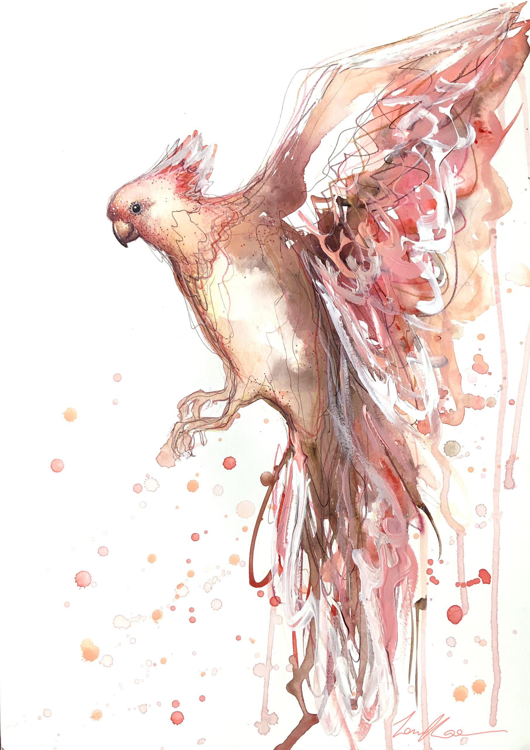 Major Mitchell Cockatoo Spirit in Flight by Sydney artist Leni Kae. This pink cockatoo is painted on A3 paper, flying free with hues of salmon pink, pastel pink, and soft brown tones. It symbolises living a life led by the heart – true joy in flight!