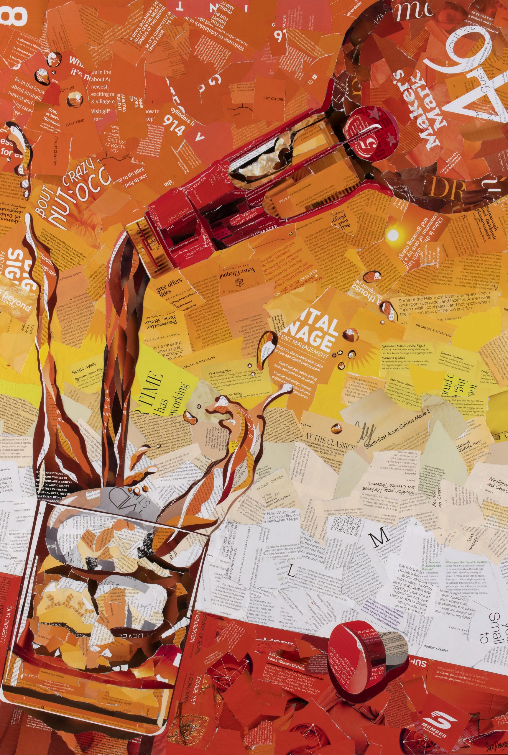 I use recycled magazines, type, maps, photos, patterns and more to create one-of-a-kind collages. By ripping and cutting up these items I am able to construct unique works of art that appear semi-realistic from a distance, yet abstract up close. I love people to lose themselves in my artwork, scanning the fine detail to discover the text and images that intertwine to make these unique ‘paintings’.