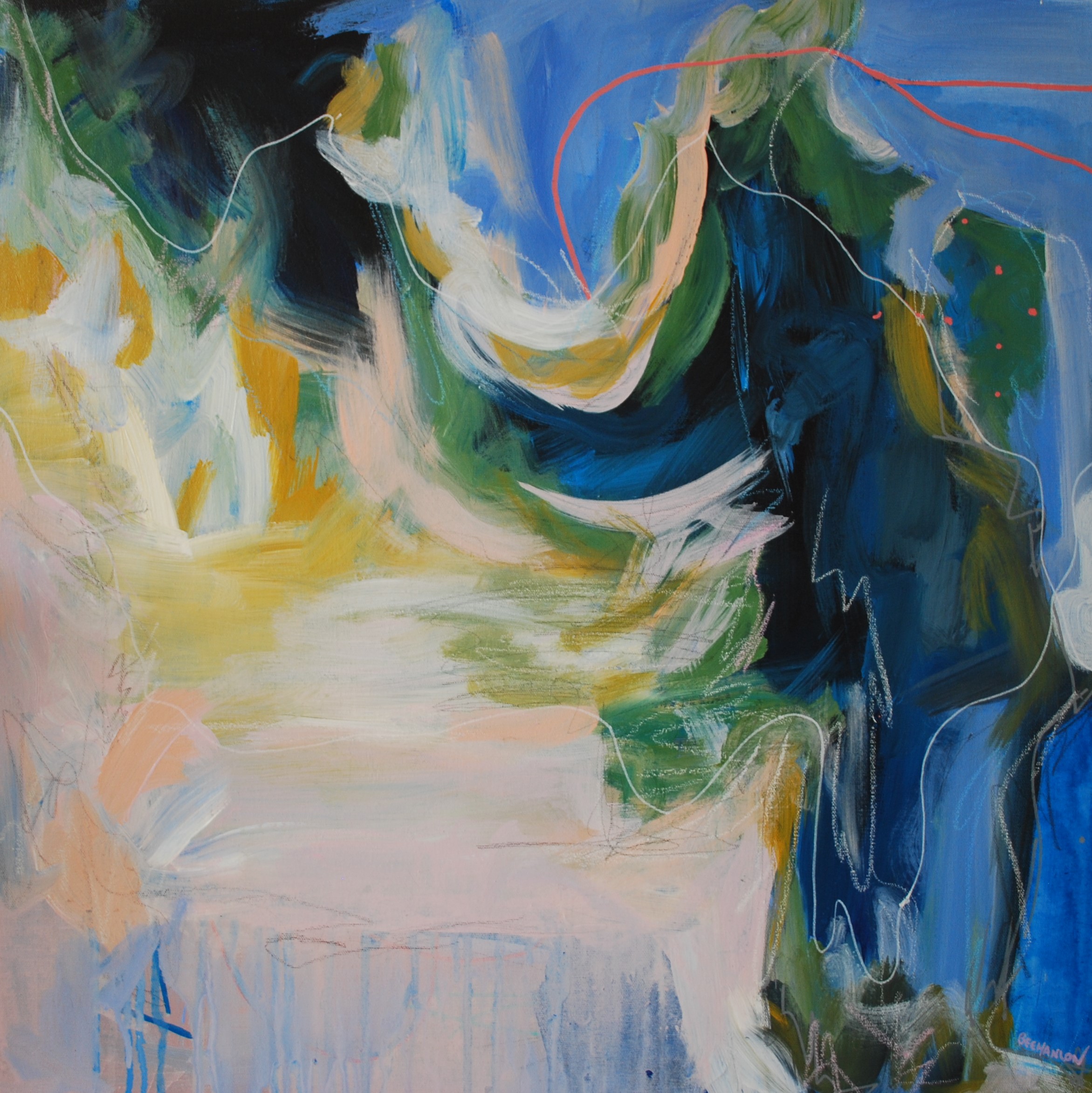 Making a Mess of out Your Dreams – This work is part of my exploration of a process driven art practice with emphasis on play and experimentation. I work mainly in acrylic and a variety of mixed media (oil pastels, pencil, graphite, makers) on canvas and paper. Using a dynamic process of layering, marking making, texture and colour, I strive to be fluid and spontaneous in my work.