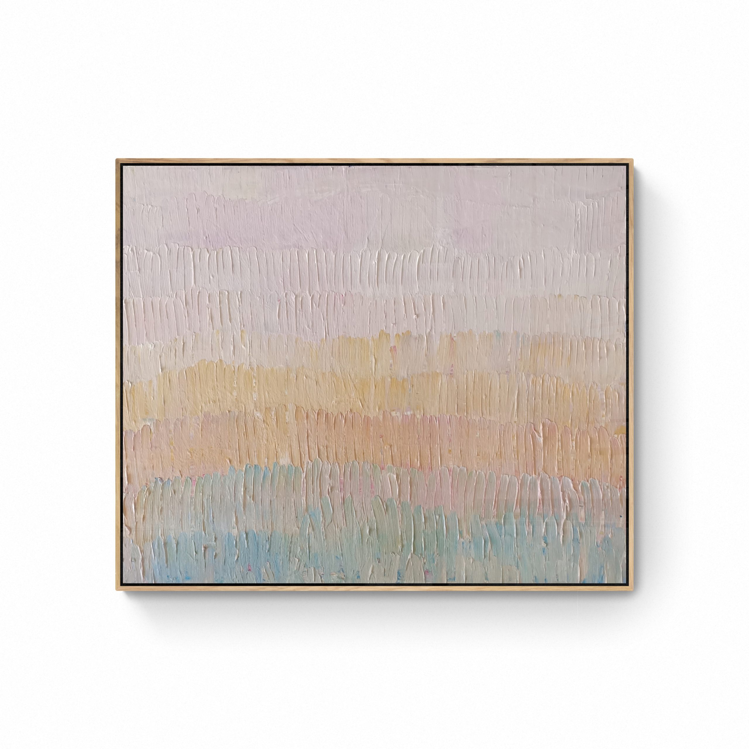 Highly textured work built up if many layers. Warm tones in a pastel pallet.
