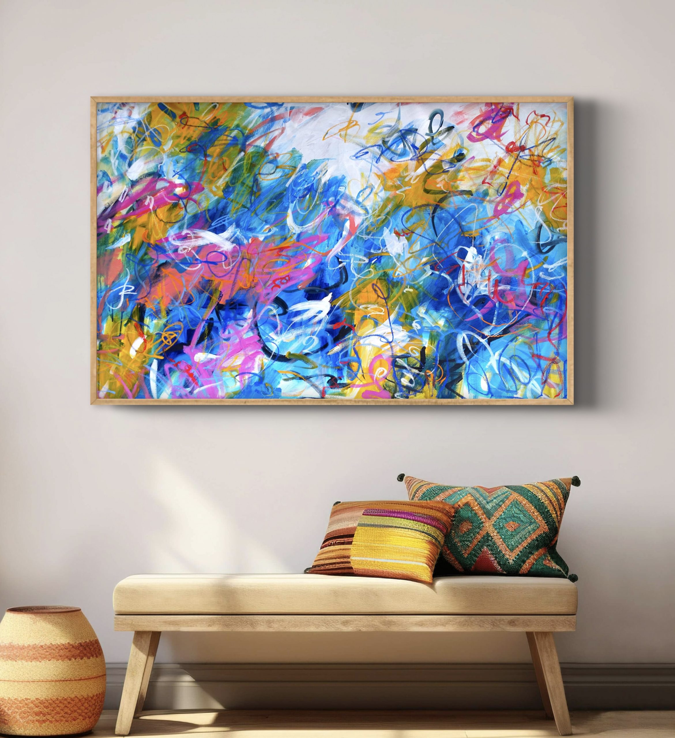 The work is sealed with a conservationist Gloss Varnish and is painted on Fine Belgian Linen which provides a beautiful finish for the paint and is long lasting so gives the painting posterity for many hundreds of years and the conservationist quality varnish is essential as it doesn’t yellow or crack with light and age and means that you can wipe the painting free of dust with a damp cloth if you need to which will also preserve its life. The painting continues on the sides so if you hang the painting stretched without an exterior frame it will still look lovely from any angle ( see photo – no ugly white sides). I hang all work in my home without an exterior frame as I feel it allows the painting to continue beyond its borders in my mind. However I have included images of the work in a frame so you can see what a frame is going to look like.