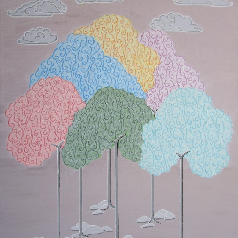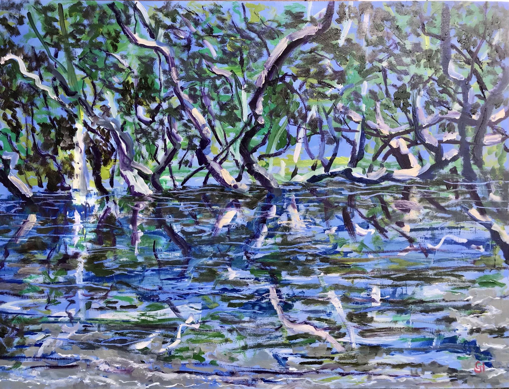 this painting is in oil paint on a cradled wood panel, and is of some of the Mangroves along the shore at Kareena Creek, a tributary of Port Hacking in Sydney’s South.( W 80 x H 60.5 x 2 cm) sides black, wire across the back.
