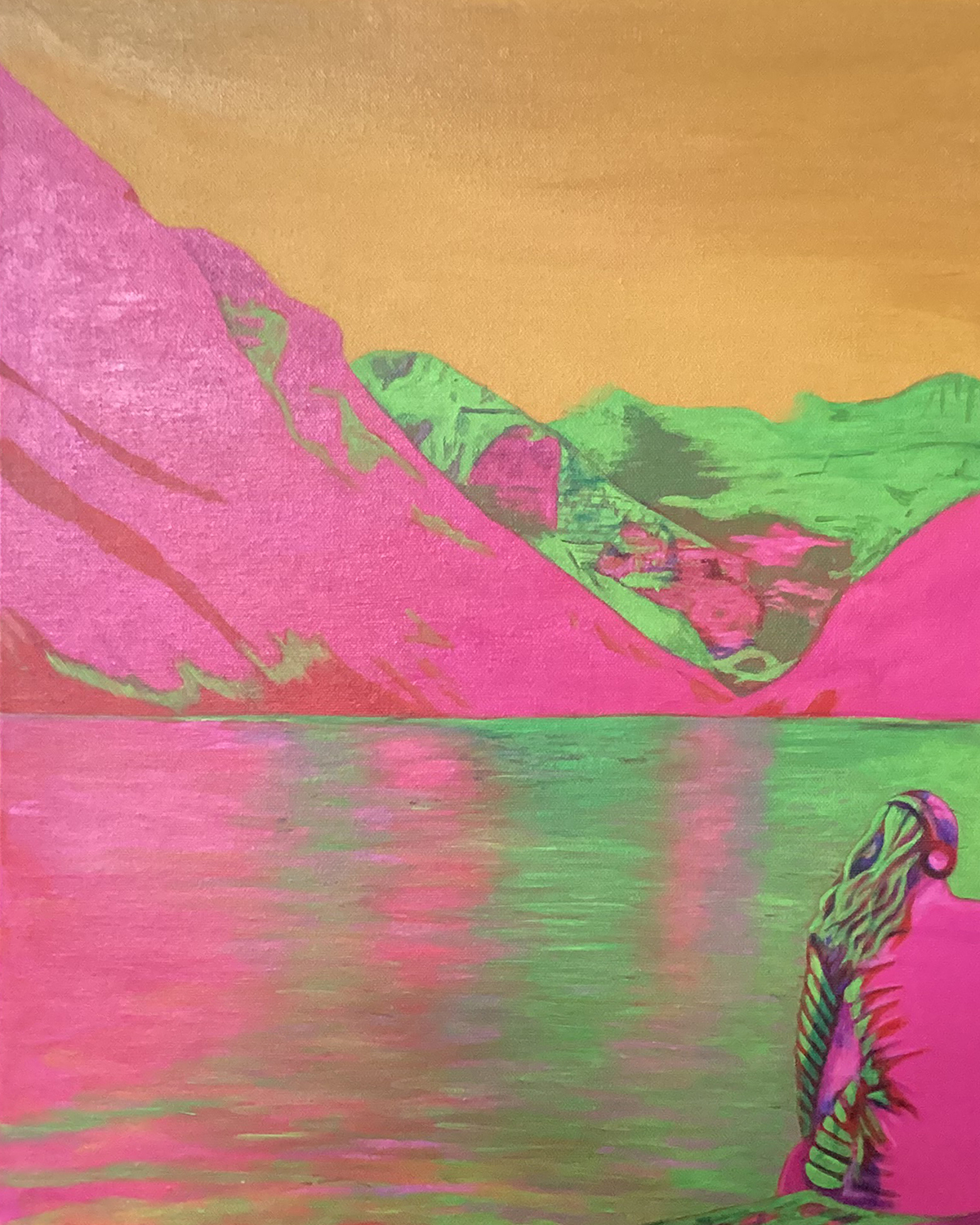 “Manifest” is an acrylic painting of Teresa’s daughter Sheridan at Lake Louise in Canada taken from a photo taken in 2024. Teresa passed down her love of adventure, travel and manifesting your dreams to her daughter and Sheridan who is now living in this idyllic location.
