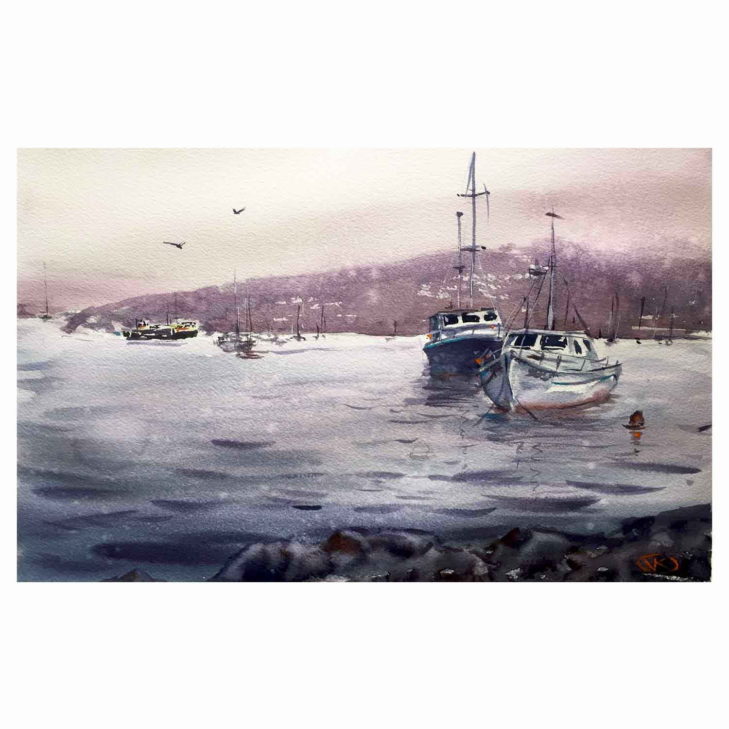 Australia, ocean, harbour, boat, beach, clouds, sunset, watercolour painting.