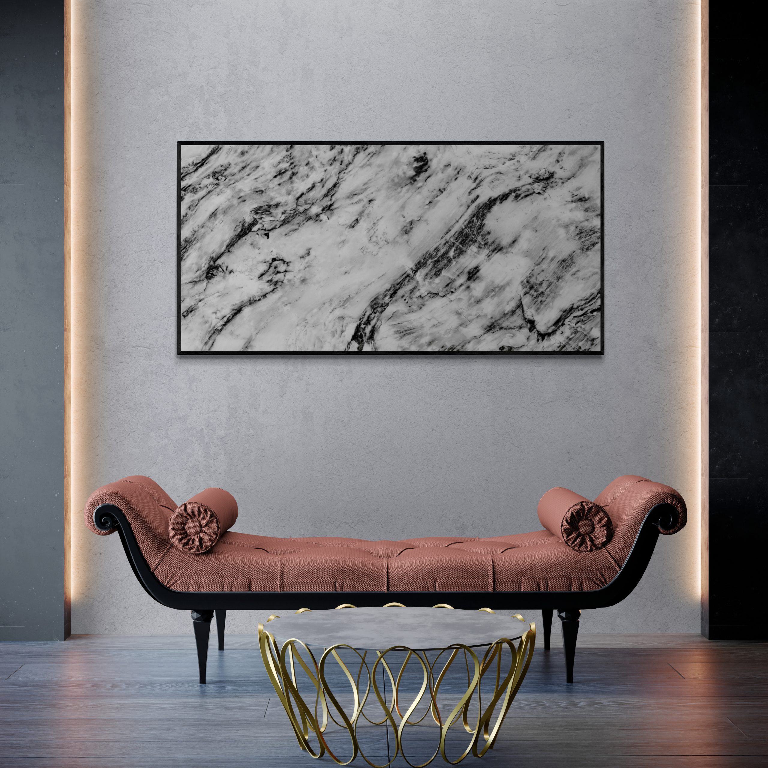 Original abstract presented on stretched canvas, heavily textured with marble effect.