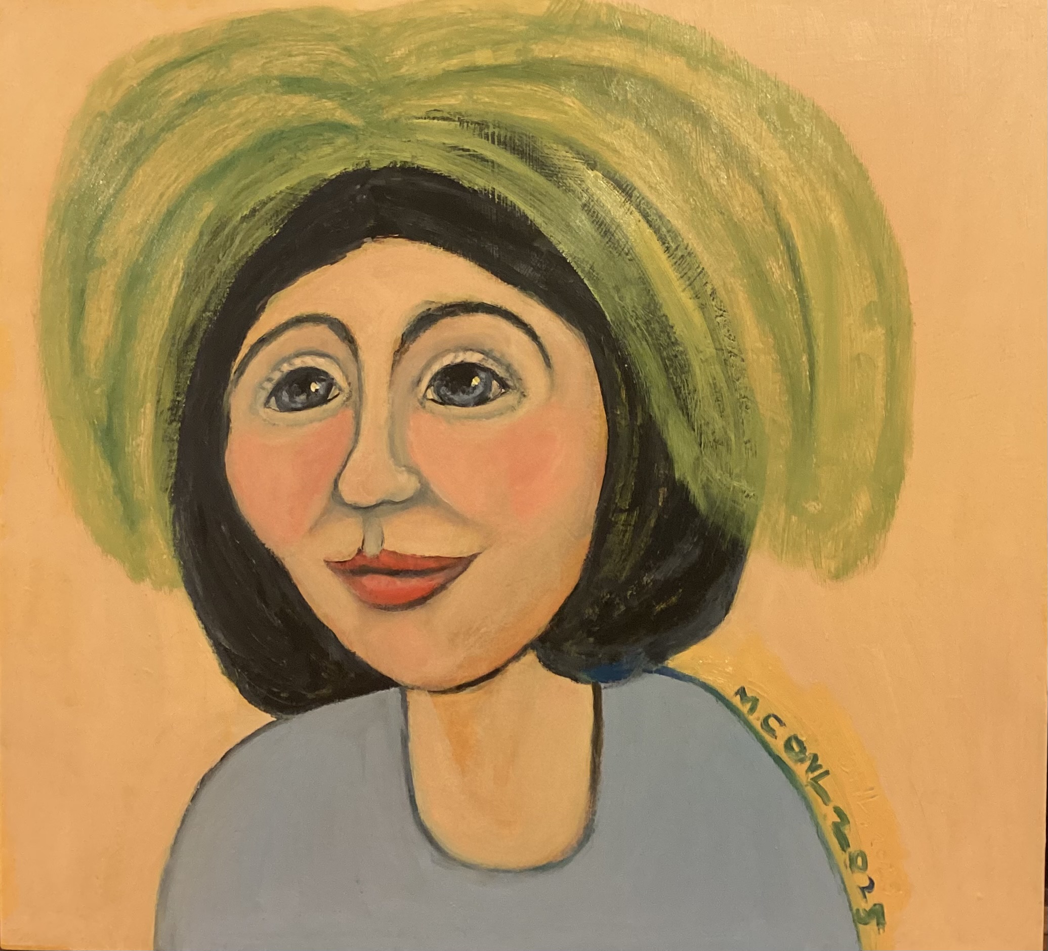 Oil painting on Birch Panel. Dark haired woman with orange pink background wearing blue green hat and a blue grey top.Painted by t Margaret Connell