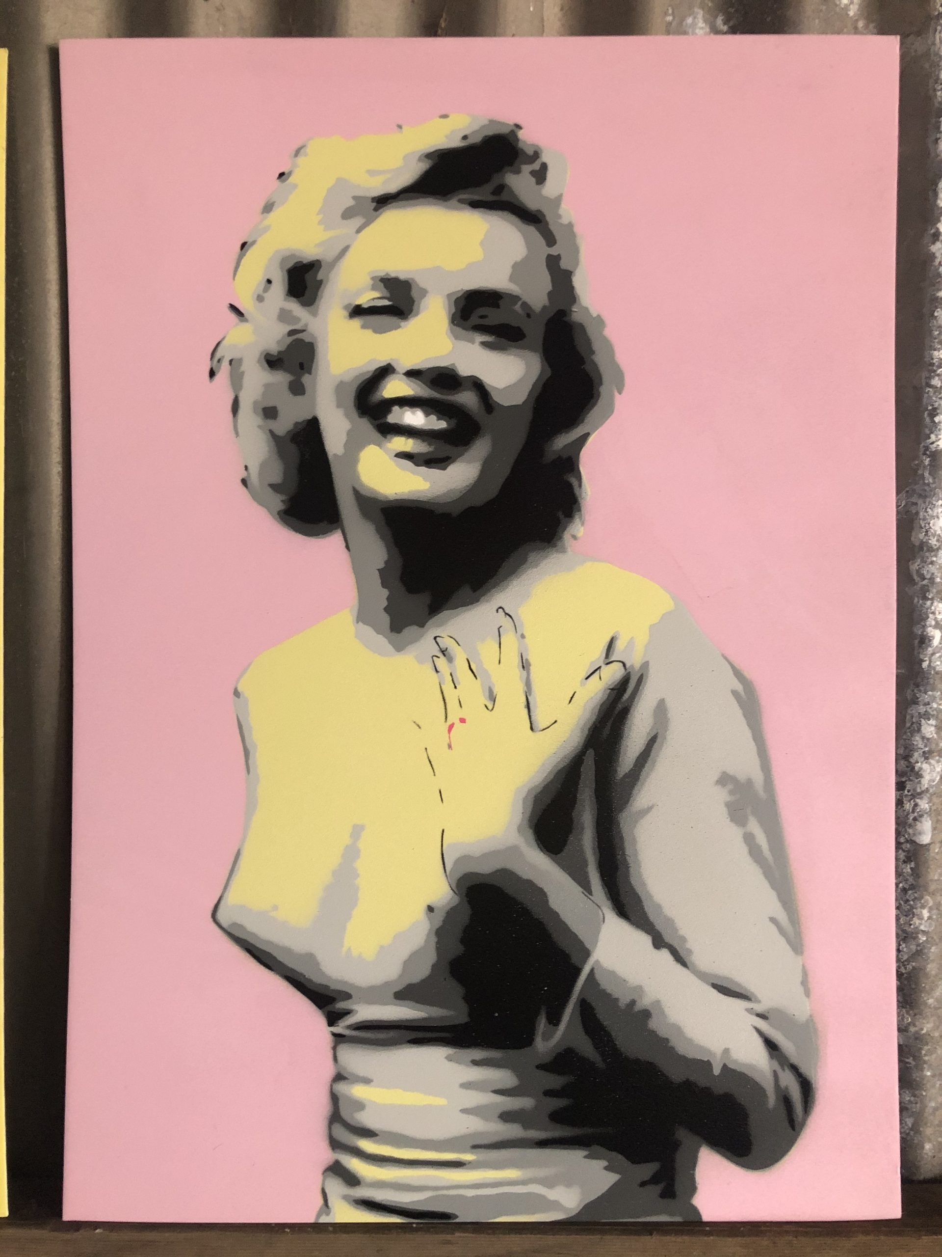 This work is a seven (7) layer stencil piece – hand cut and sprayed using quality graffiti spray paint. A street based style to a glamour icon.