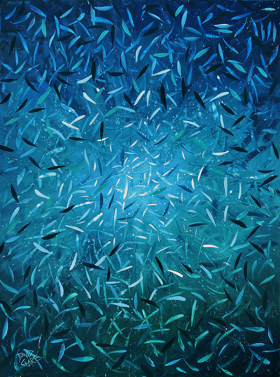 Marine Land by David Clare – Oil painting of fish in deep blue ocean, on thick stretched canvas, ready to hang. I am constantly inspired by the colour of the ocean, and the magic of schools of fish. However I had to take a break from them recently due to “over fishing”! The break has renewed my enthusiasm for these paintings, and this is one of a fresh new series that matches the energy of the fish themselves.