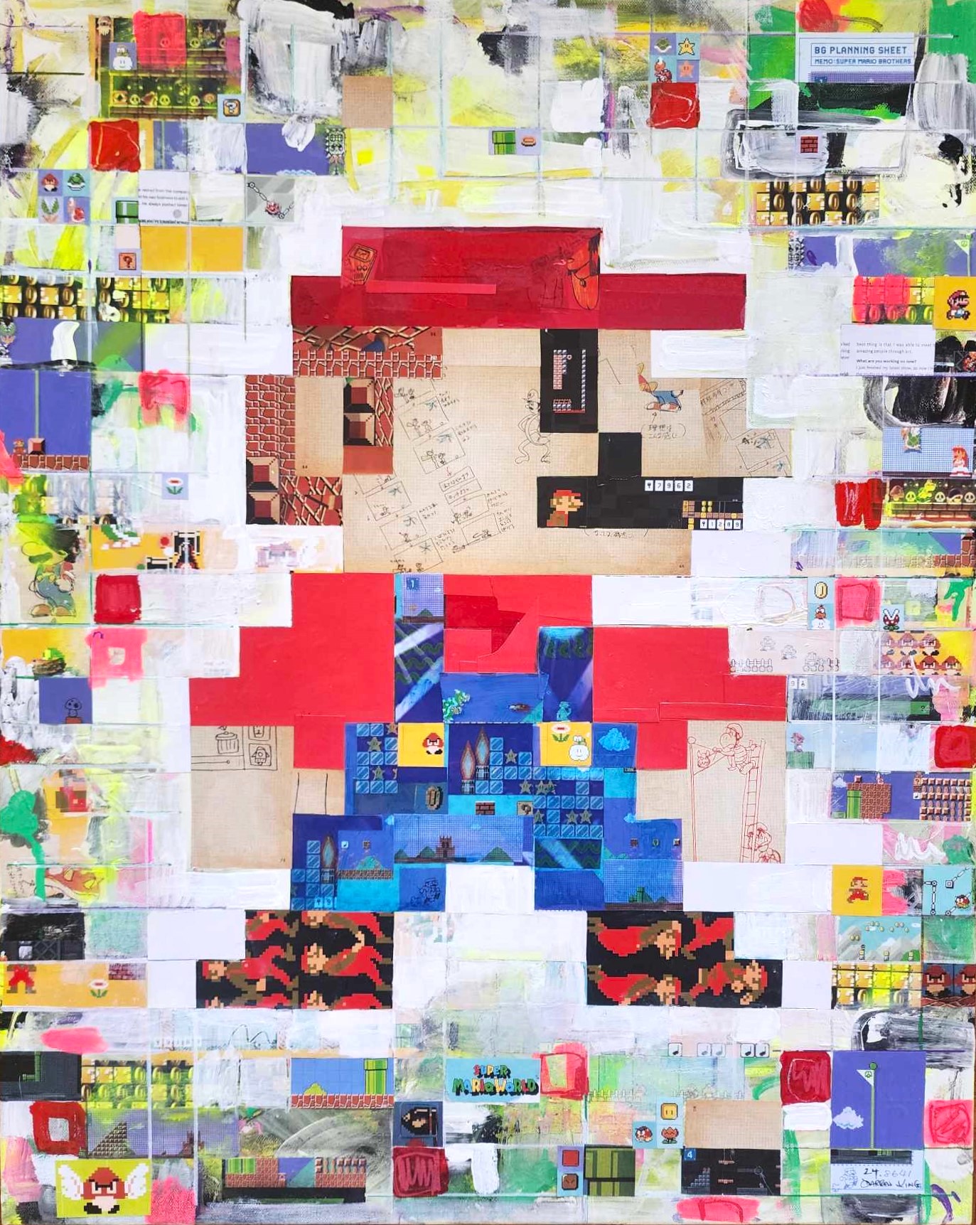 The collage elements have been taken primarily from my an old Super Mario Brothers book. So loads of Super Mario video game, related imagery appear throughout this piece. Lots of characters, scenes from the games.