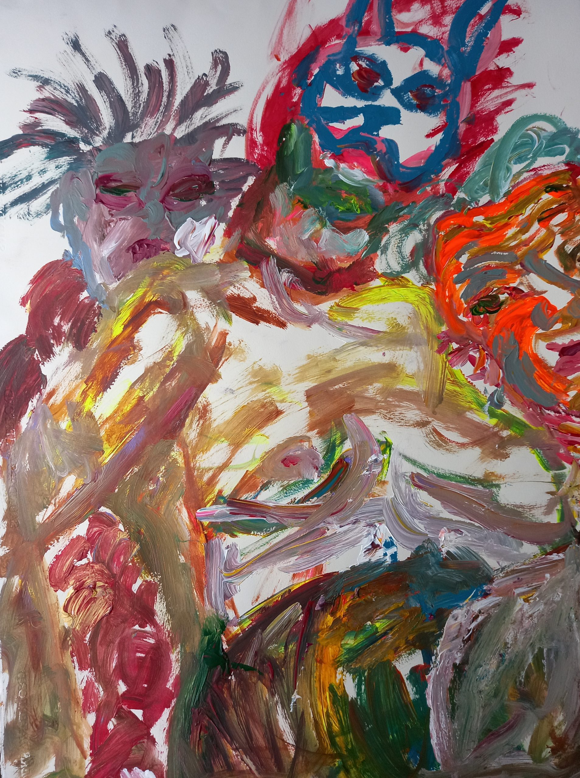 Celebrating the surreal and bizzare. Influenced by venetian masks. When centuries old carnivals, enabled people to wear masks attending with hidden indentites! Painted expressively and colourfully.