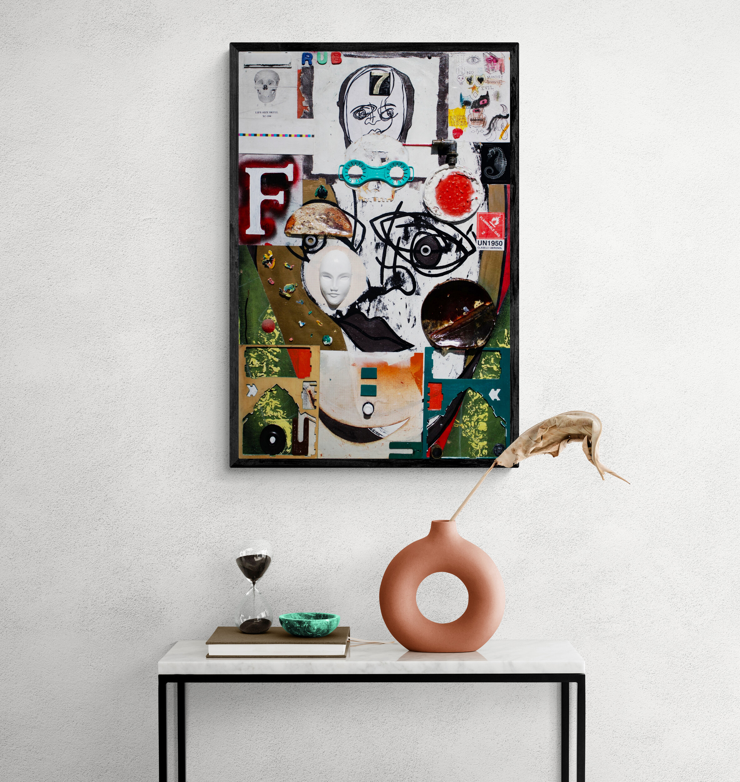 Masking by Rehgan De Mather Mixed media – acrylic, spray paint, oil stick, paint skins, paint tin lid, plaster and collage on marine ply.