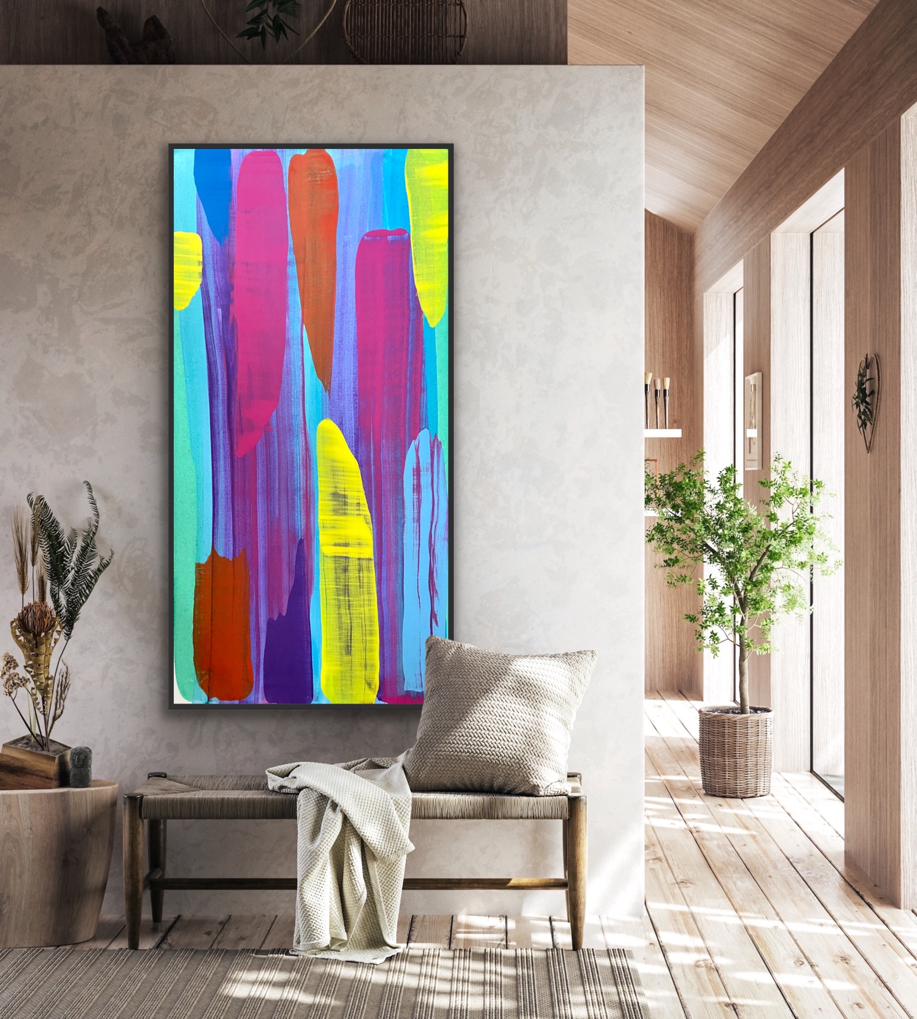 Please note, this artwork is stretched and ready to hang but not framed, framed photos are shown to give perspective of a framed setting.