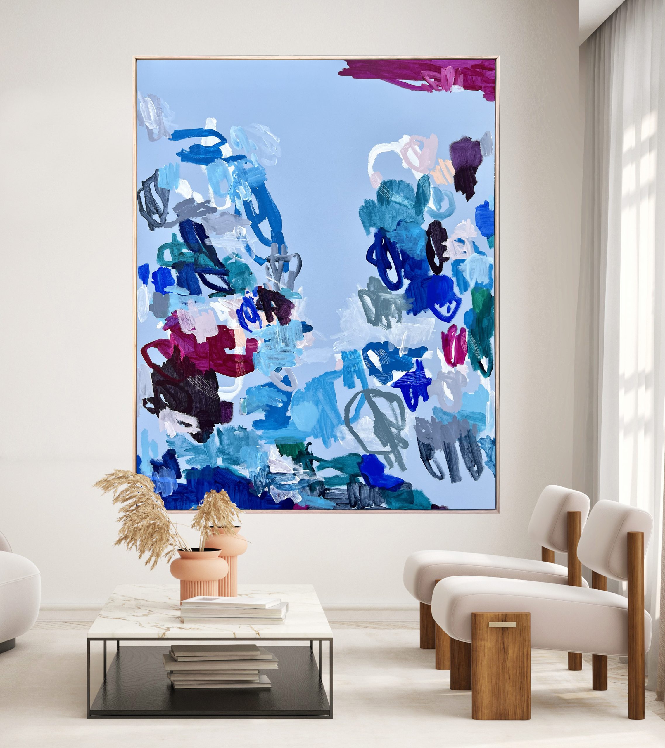 Drawing inspiration from nature, this piece was created to capture the energy and form of the hidden Australian coral reefs. The organic and free flowing shapes and colour combinations work together to build a captivating abstraction of an immersed world.