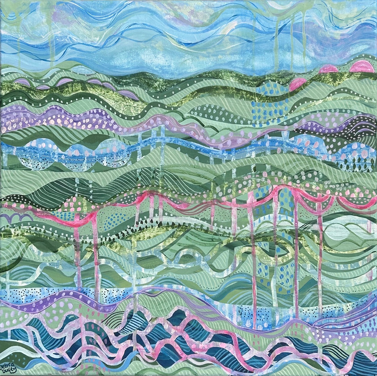 This artwork is an abstract style landscape. I have weaved many layers of contrasting textures creating ribbon like shapes and curvy lines to suggest a patchwork of contours in the land, rolling hills, waterways and soft shimmering patterns. This imaginative creation that is a little bit whimsical, but with the lush green colours and soft pinks, purple and watery blue hues makes this peaceful landscape come to life. This joyous artwork is an authentic and original artwork and was made with love, thankyou for visiting x