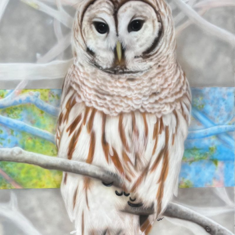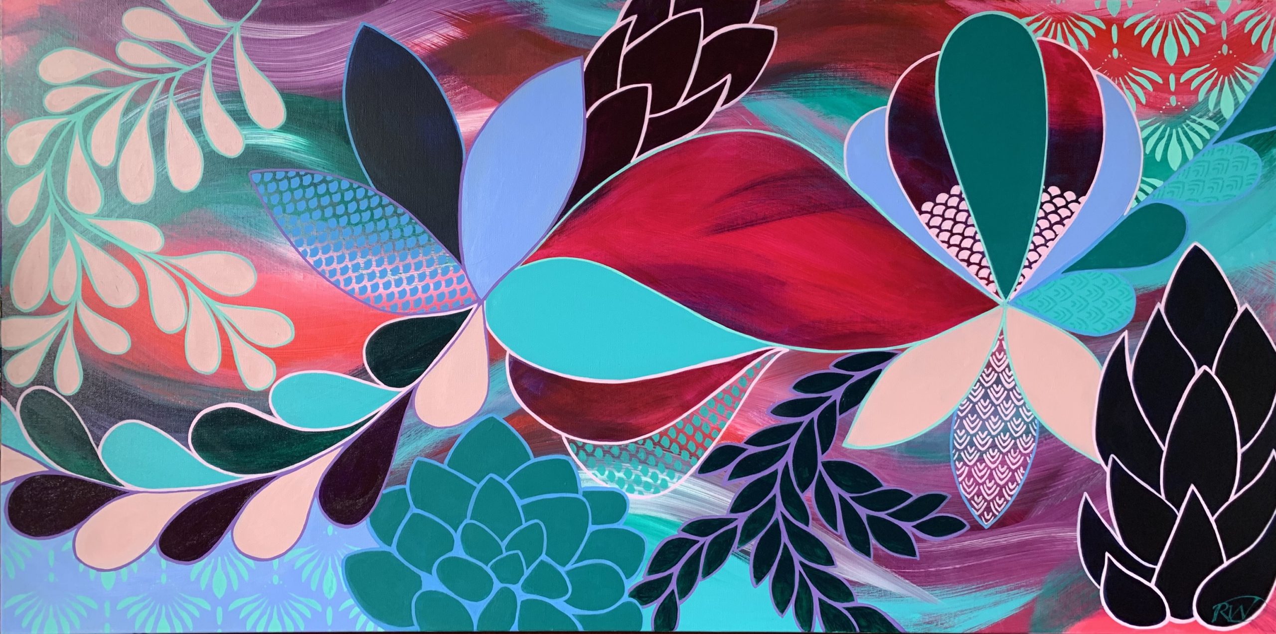 This vibrant artwork reflects strong aesthetic appeal in the use of meandering pattern and shape. An abstract background layer has been built up with stencil patterns and organic shapes to create a harmonious sense of direction drawing in the viewer’s eye. This artwork reflects my enjoyment of incorporating zentangle pattern and vibrant colour palettes in the creation of artworks. I have also been inspired by succulents in the creation of this work and have incorporated these in silhouette form. Meander 3 is ready to hang and would be an amazing feature to any blank wall space.
