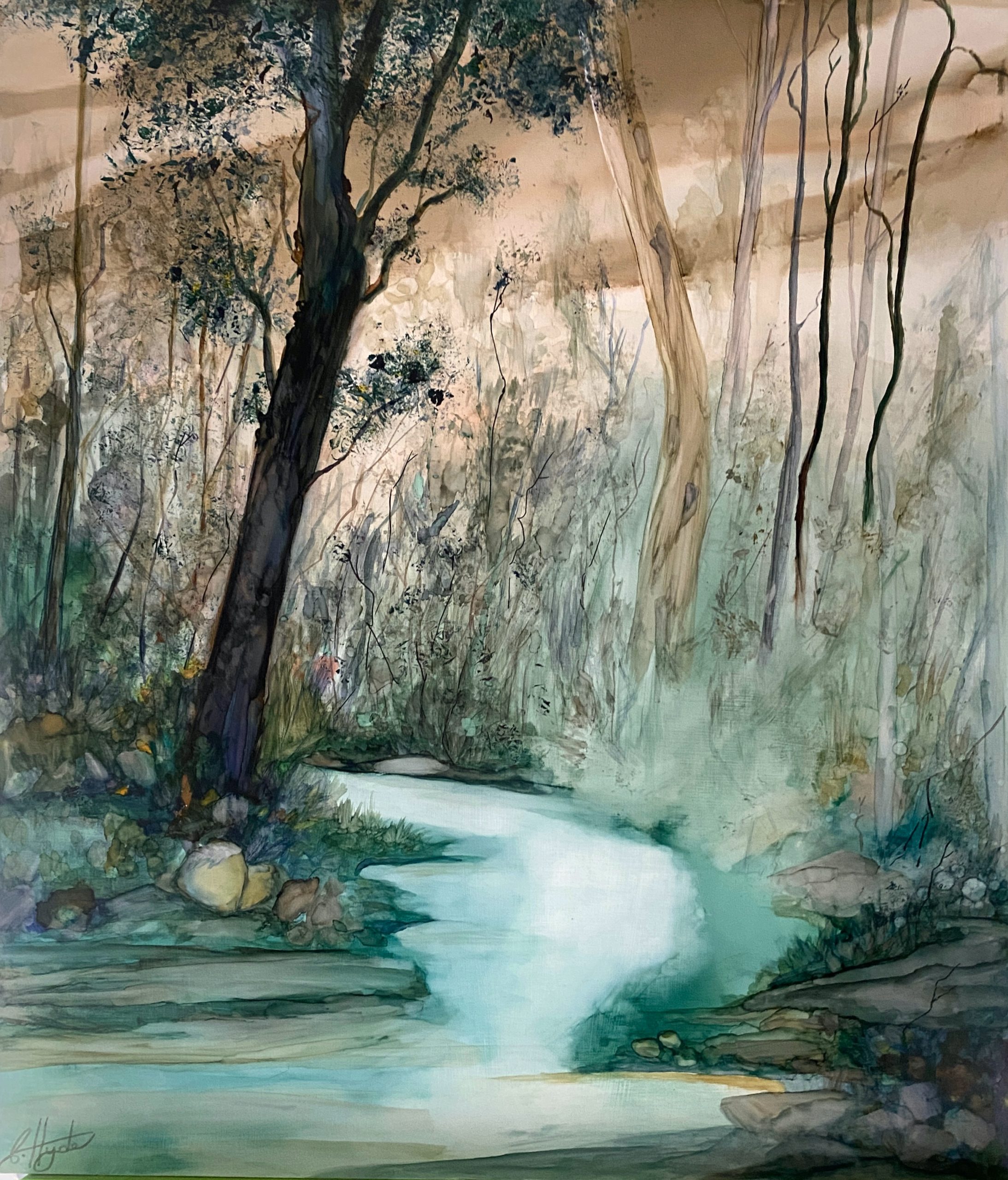 Meandering Creek by Christine Hyde – A serene landscape of a Meandering mountains Creek, created using professional grade alcohol inks, hand-painted onto a cradled wooden art panel. It depicts a familiar landscape of the Blue Mountains of New South Wales Australia which is where this Artist lives and creates her paintings. The intimate sense of place is recorded here, always at the core of her art practice. The muted earth tones reflect the quiet time of day, soft blue, teal, light brown, white