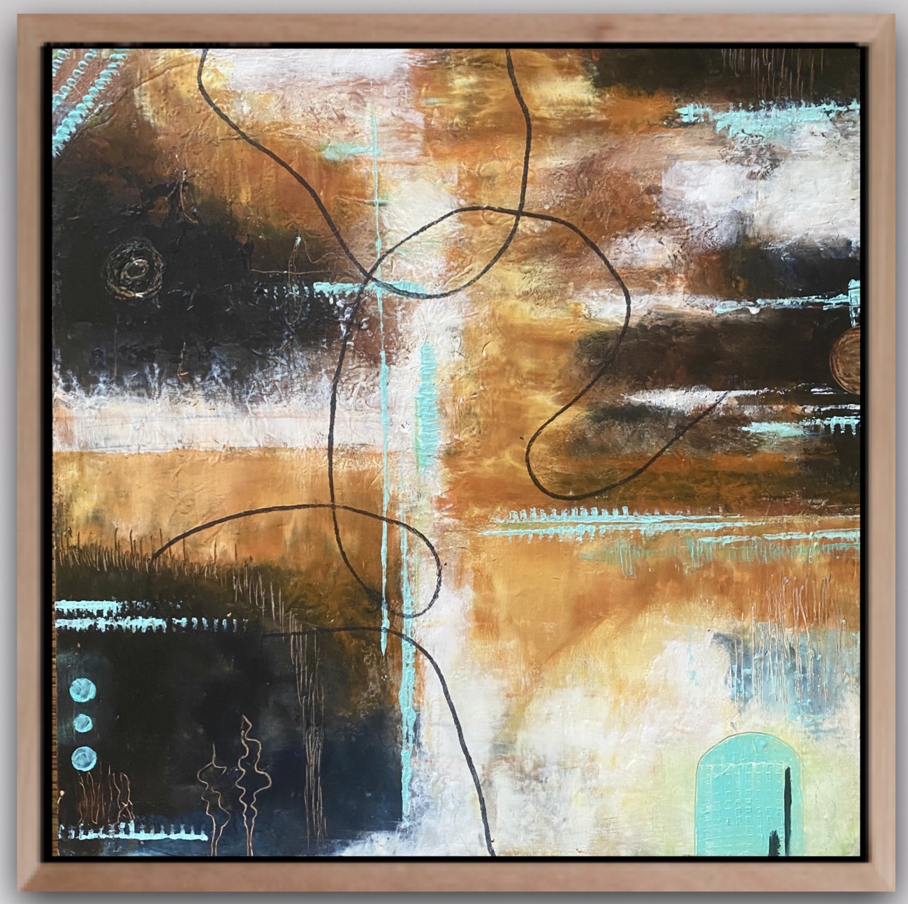 Intuitive abstract inspired by the paths of the National Park in Noosa with glimpses of the ocean and the dense undergrowth. A