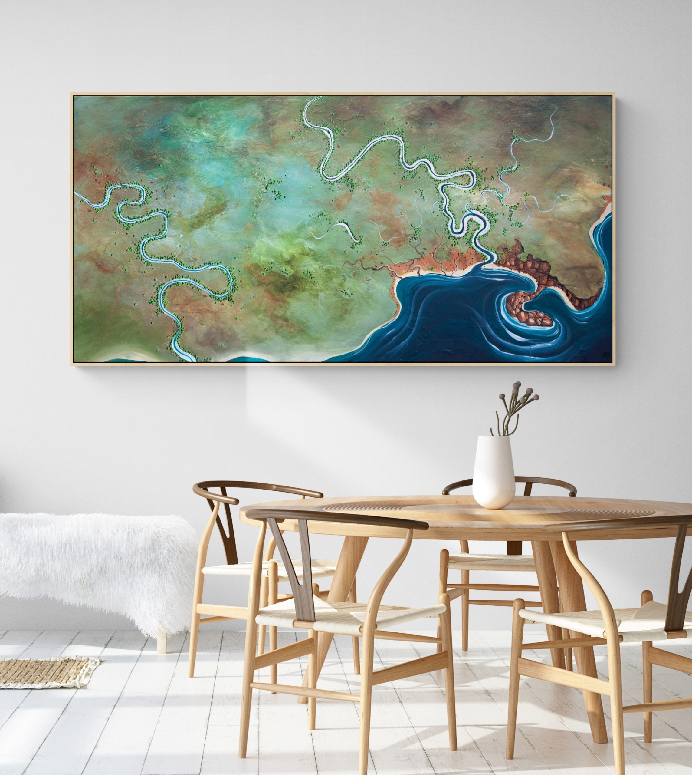 Meandering Sapphire Mountains by Tania Chanter is an aerial landscape inspired by the rich and vibrant tones of Australia and the changes of light and mood throughout the day. Tania’s hope is that this painting brings a sense of calm to the room where it lives, and that is makes the people who enter the room feel as though a part of nature is right there with them.