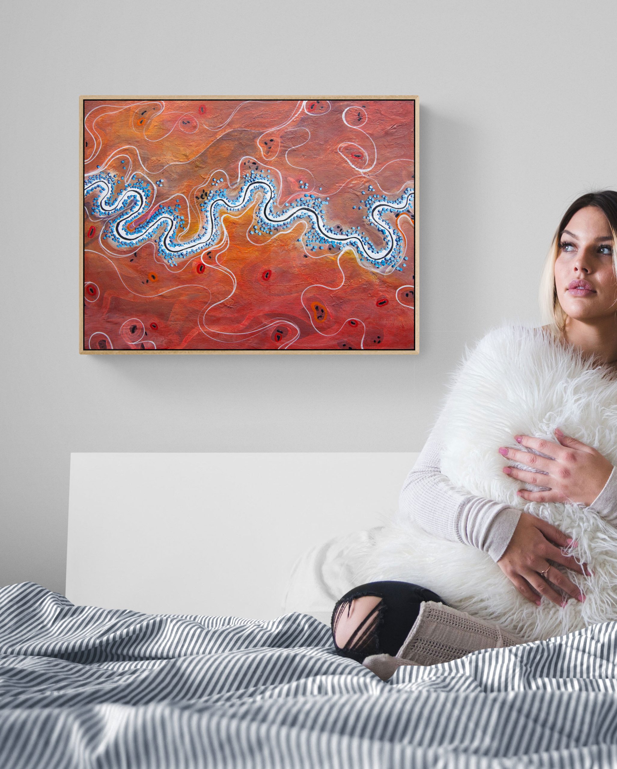 Meandering The Rich Red Land by Tania Chanter  is an aerial view landscape inspired by the rich and vibrant tones of Australia and the changes of light and mood throughout the day.