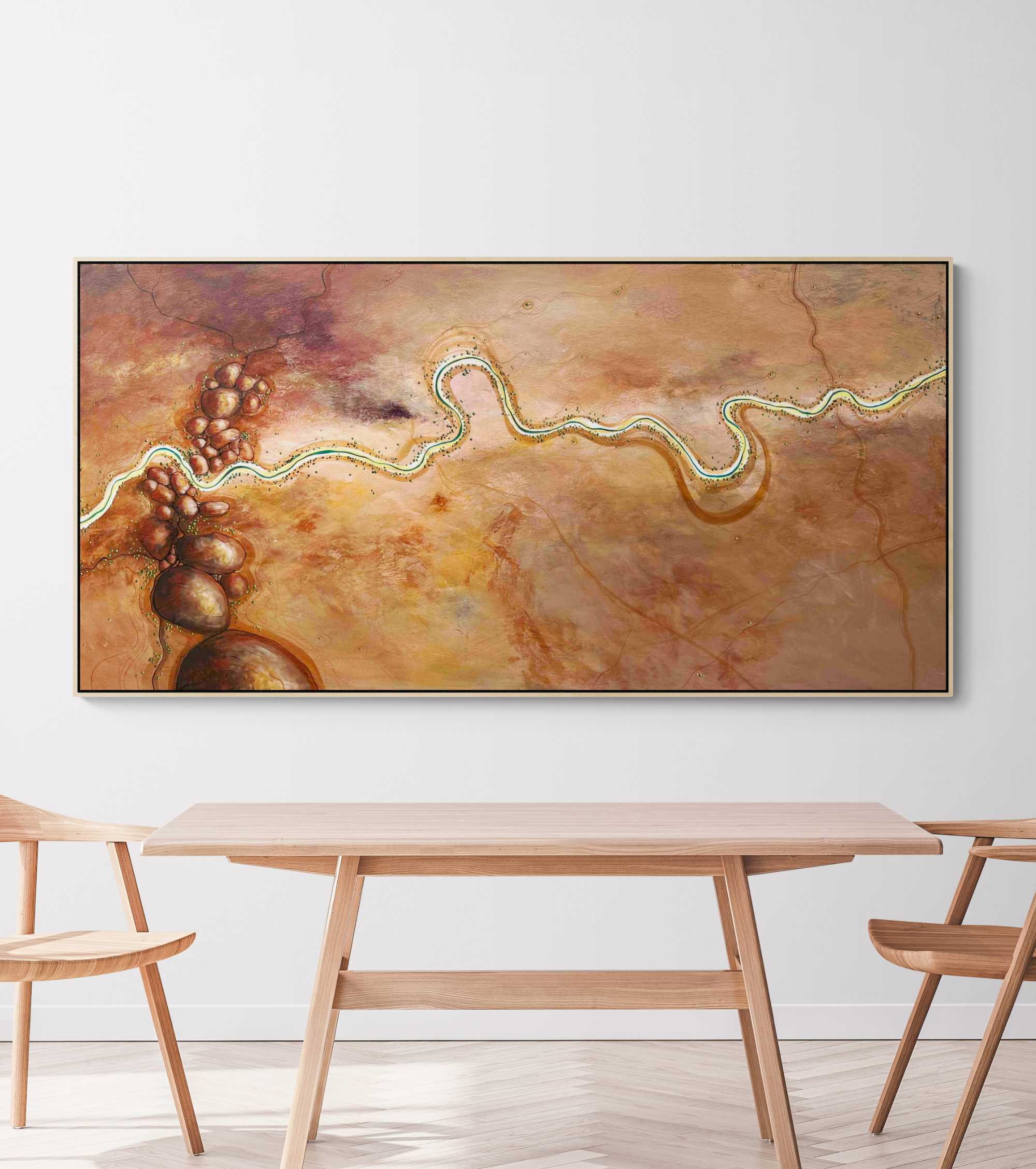 Meandering Through Country by Tania Chanter is inspired by the rich and vibrant tones of Australia’s East Coast and the changes of light and mood throughout the day. Tania’s hope is that this painting brings a sense of calm to the room where it lives, and that is makes the people who enter the room feel as though a part of nature is right there with them.