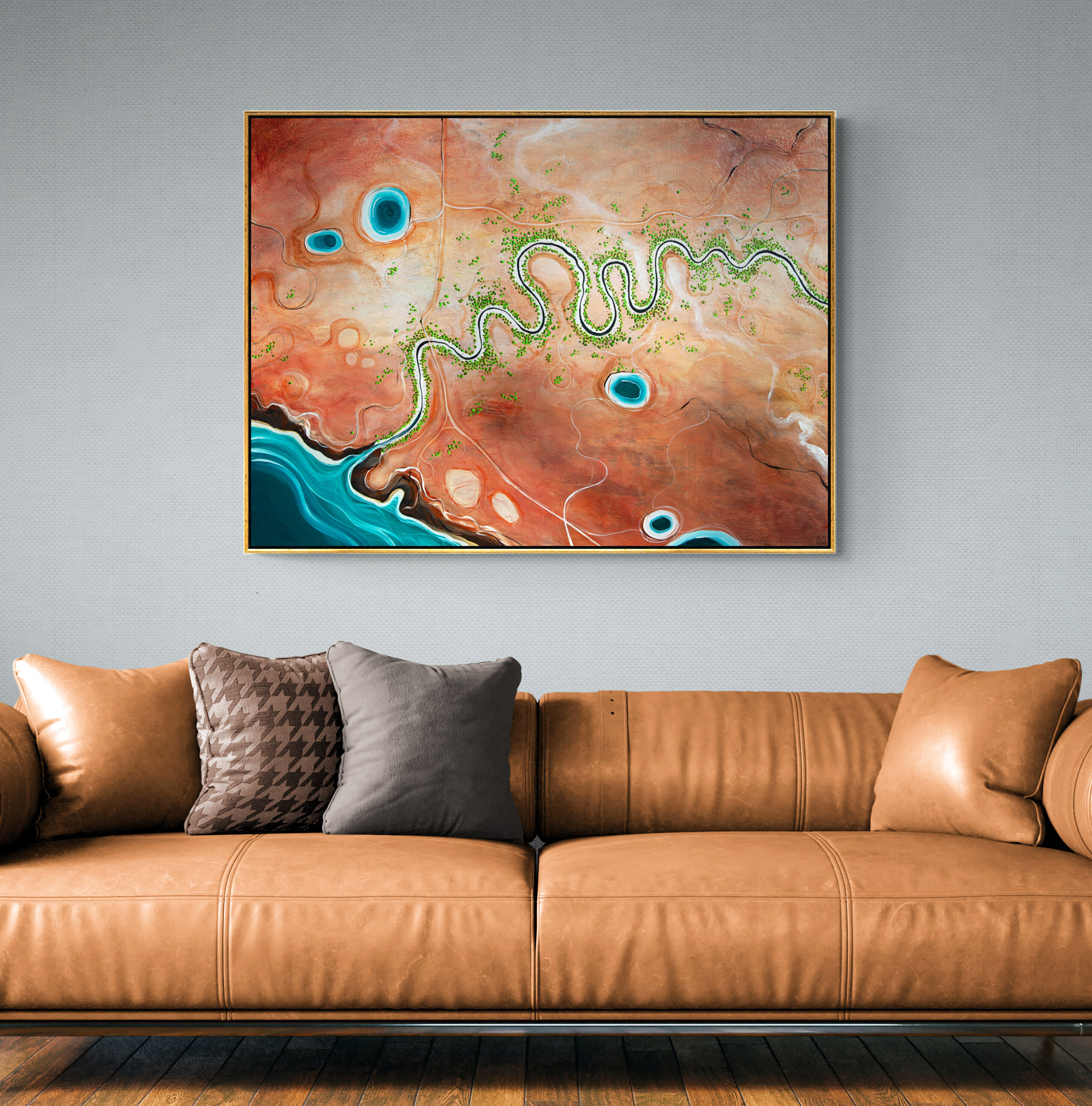 Meandering To The Inlet Of Hope by Tania Chanter  is an aerial landscape and is inspired by the rich and vibrant tones of Australia and the changes of light and mood throughout the day. Tania’s hope is that this painting brings a sense of calm to the room where it lives, and that is makes the people who enter the room feel as though a part of nature is right there with them.