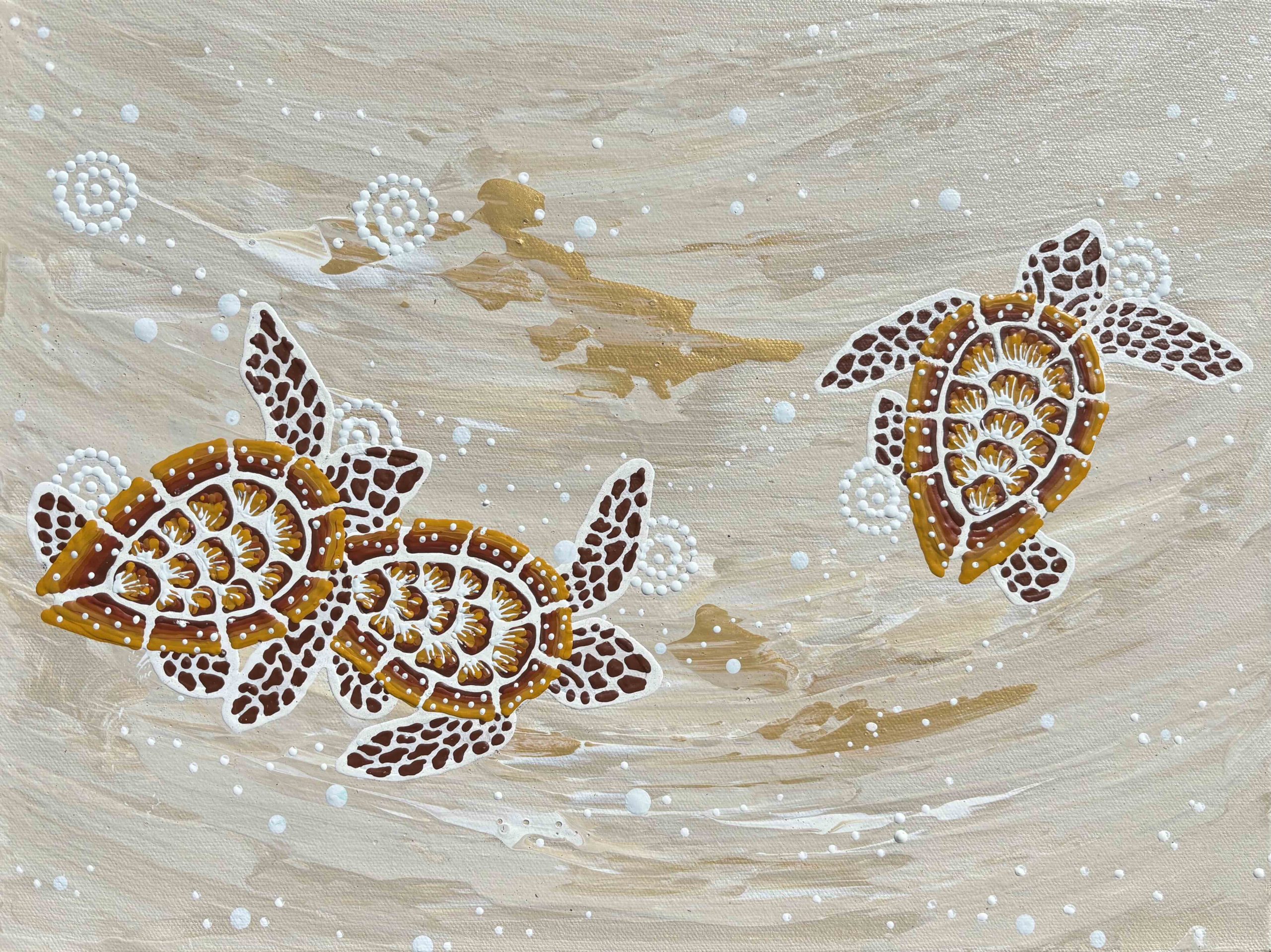 This artwork shares the story of mee-bar (saltwater turtle) hatchlings navigating over sand dunes as they make their way down to the ocean for the first time. While heading across the sand, the little mee-bar map the beach so they can return home to this same spot after 10-50 years.