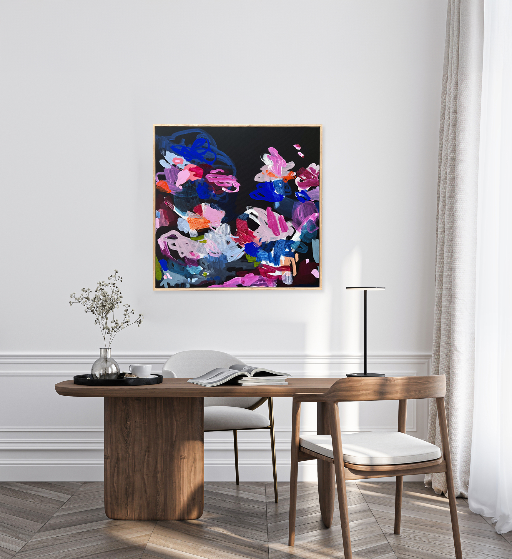 Meet Me at Midnight by Rebecca Koerting – As a child I was forever daydreaming about different worlds. I loved seeing these worlds in colour and really feeling these colours within my soul. This painting is full of colour – an abstraction of a hidden coral world beneath the sea, with beautiful vibrant colours.