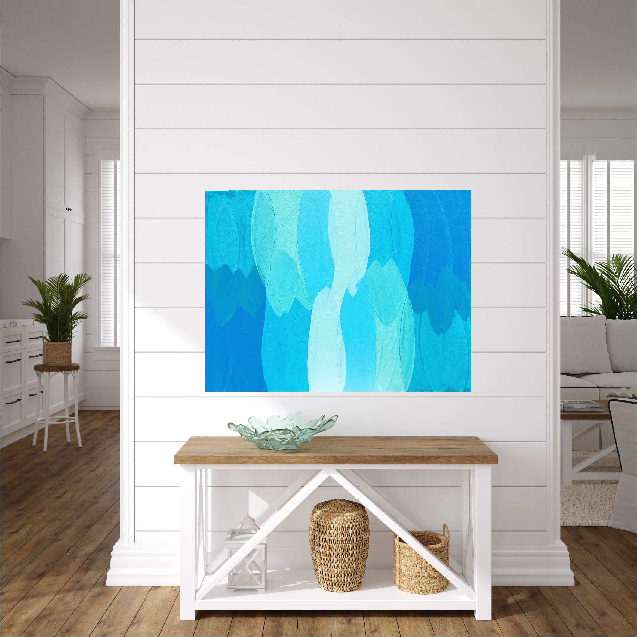 Acrylic on canvas in ocean hues.