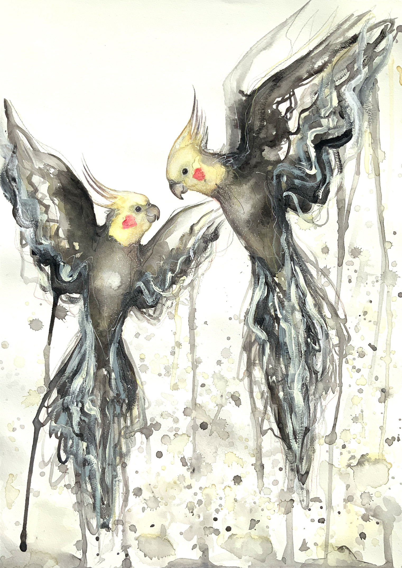 • Sydney Artist Leni Kae Cockatiels Artwork Painting Watercolour Copyright