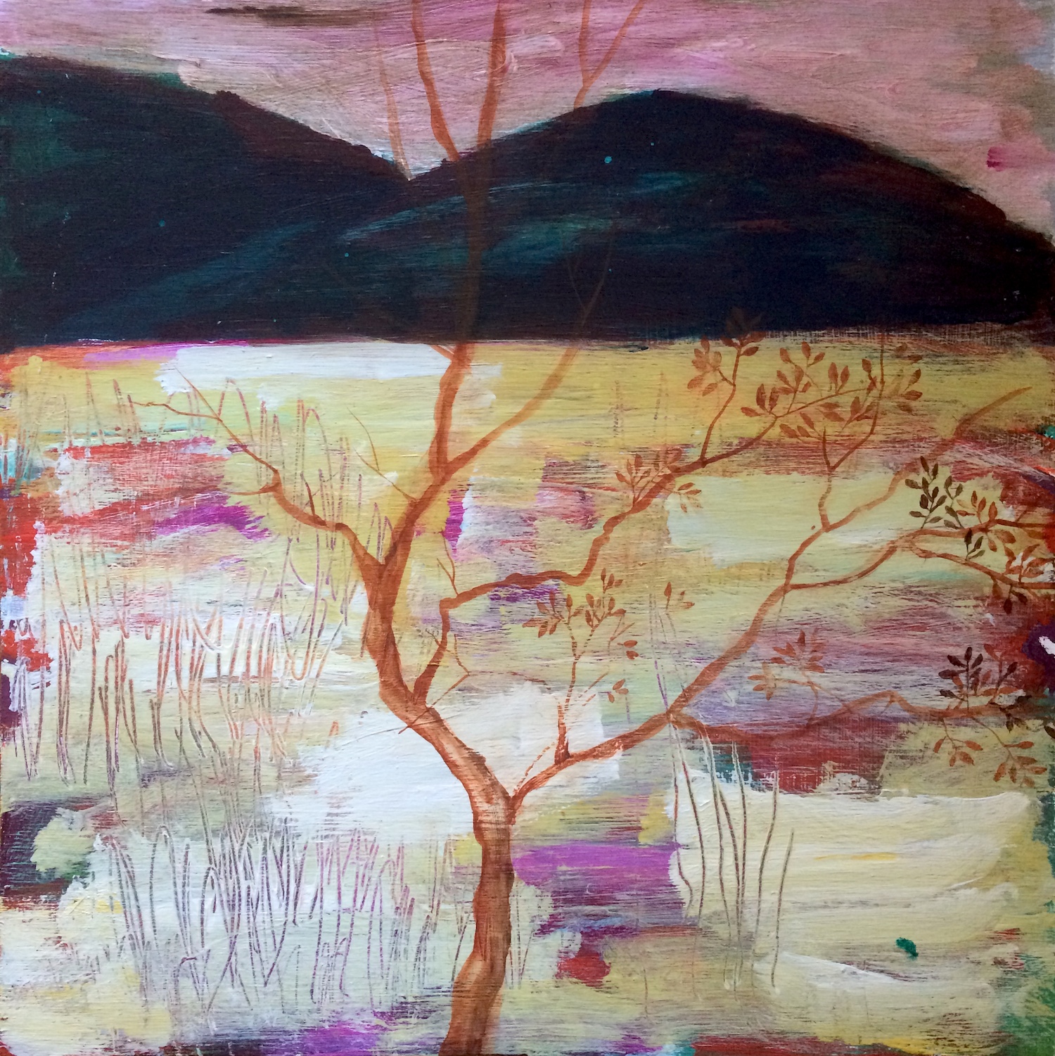 This year I participated in an art residency at Smiths Lake in Northern NSW. This work is part of a series created en plain air. The magic of the place and the transformation I experienced continue to guide my new paintings. these works symbolise a turning point for me. More honest, more direct, more lively. This painting of Smiths Lake at sunset is painted with acrylic paint on ply board. Its unframed and would look great in a wooden box frame.