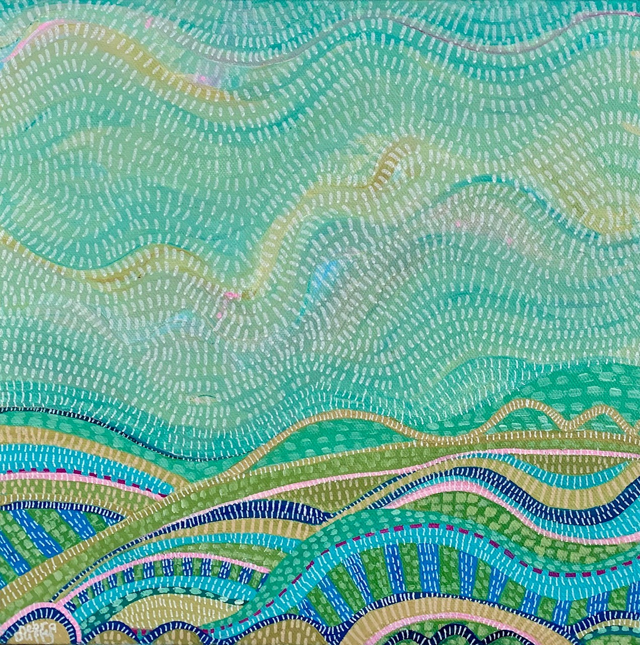 This artwork is an original abstract style landscape painting using acrylic paint and artist markers. My inspiration for this artwork was to continue with my curiosity by exploring the way the many shapes that are imprinted within the natural landscape formed by the contours of the land and the river systems that weave through by using intricate detailed patterns. With this artwork I wanted to use bold linear contrasting patterns for the landscape using bright colours such as pink, blues, tan and green. Which was also mirrored for the sky. Melody is a little gem to brighten your space and includes framing in beautiful Tasmanian oak.