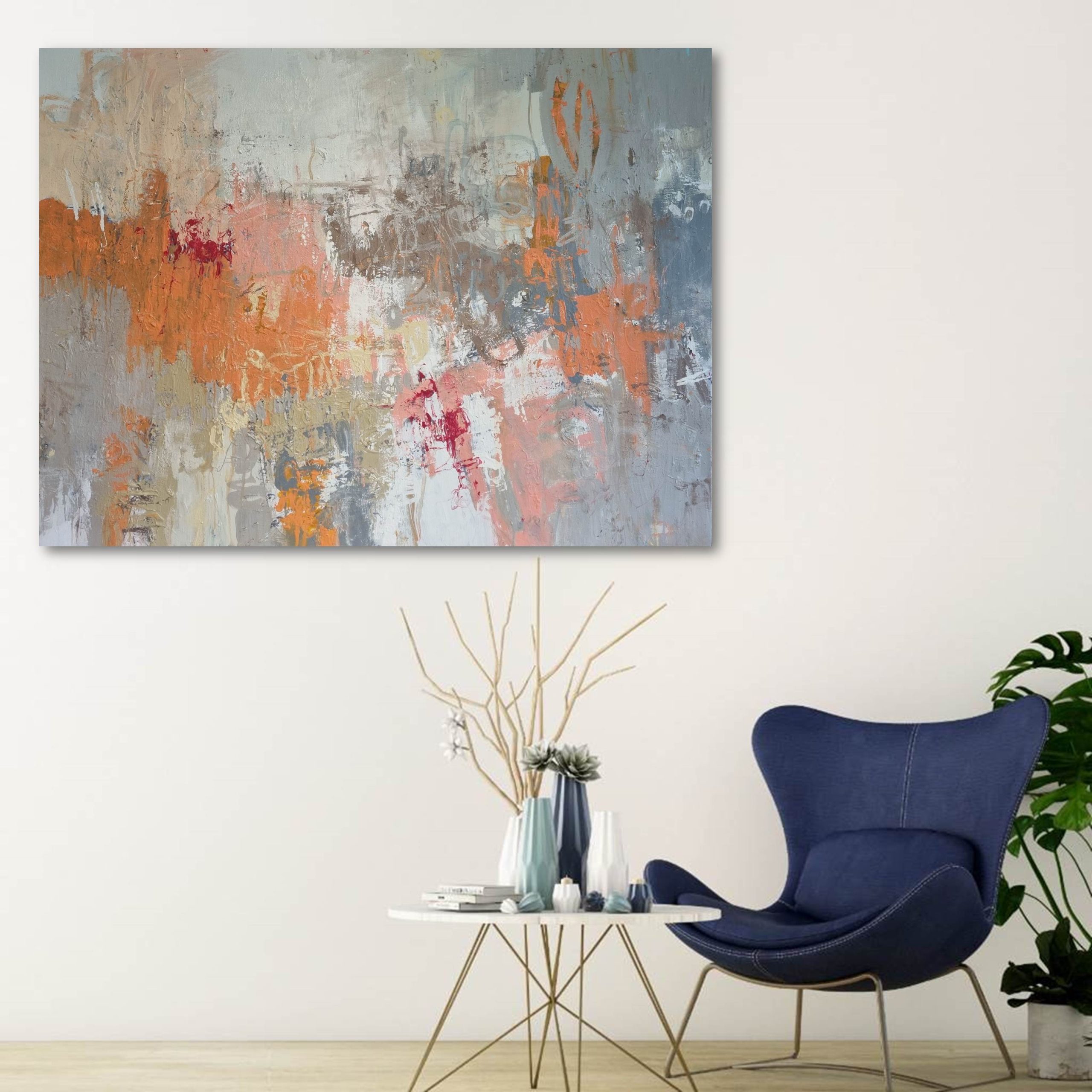 Shades, dilutions and pattern in muted neutrals, orange, dusty pink, hints of red, stone and browns teamed with soft grey and winter white tones. Featuring expressive mark-making and gestural brushwork this painting is contemporary and ambient in calming cool and warm neutral tones.