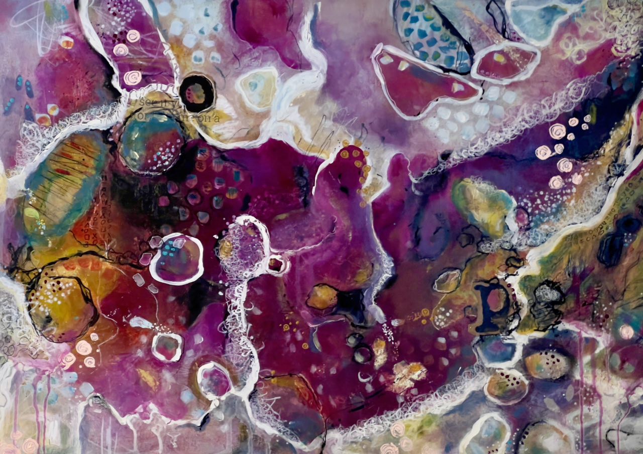 “Memorable Moments” by Brenda Tsiaousis is a reminder that life rarely goes as planned. This piece began in chaos, layers built up, scraped back, and reimagined. At one point, it was almost abandoned. But with each shift and adjustment, clarity emerged.
