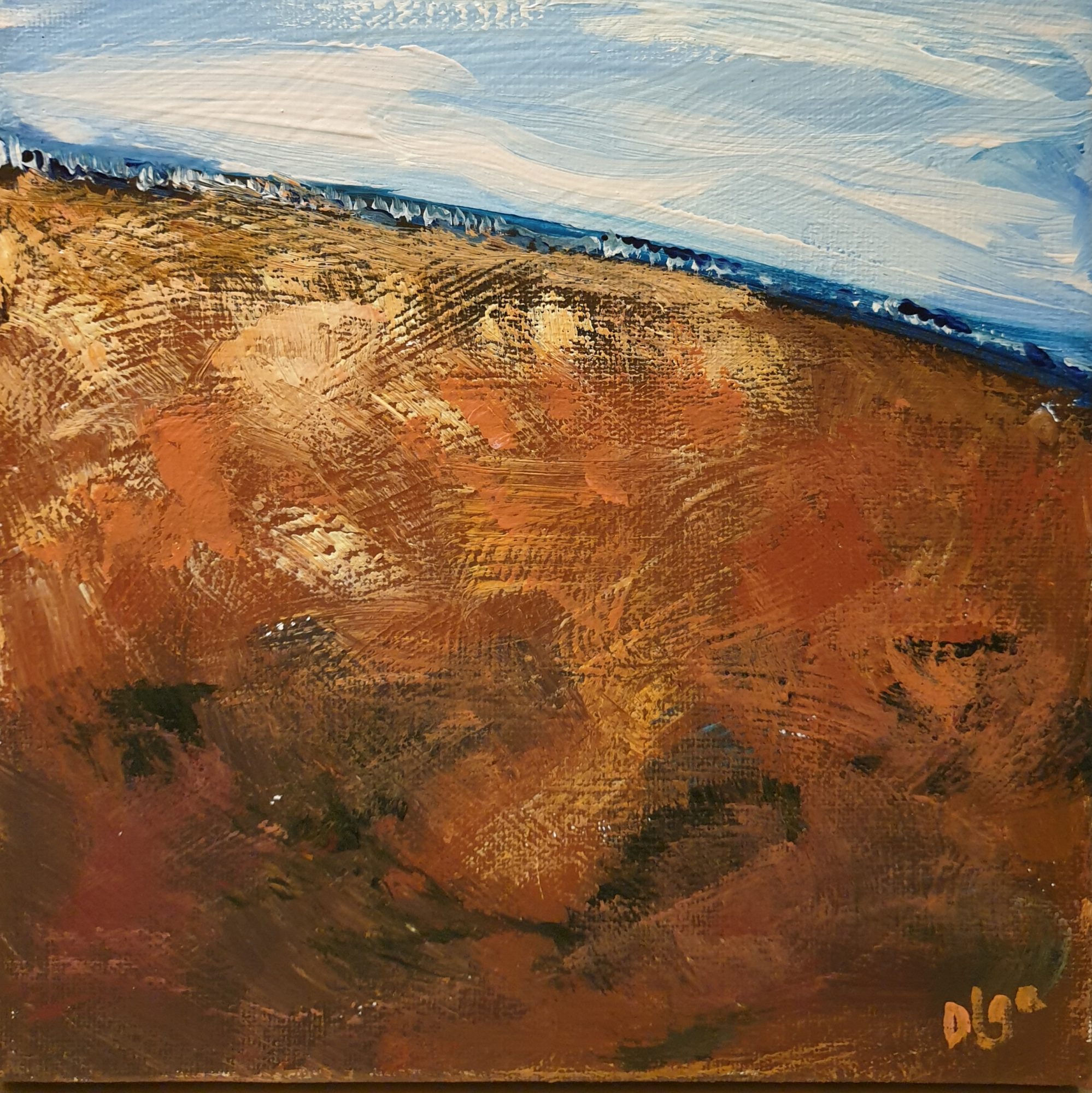 Have you ever been so familiar with a landscape that it appears in your memories? The colours, the shapes and the scents. Somehow these things are integrated into your life. This is how it is for me. This mini landscape contains beautiful, multiple layers of texture and colour. Truly more beautiful in real life. It glows with blues, rich ochres, sienna and greens.