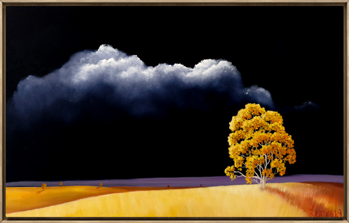 Framed in warm oak, the painting captures a moment between worlds—between day and night, light and dark, permanence and change. This tree, this sentinel, holds the line.