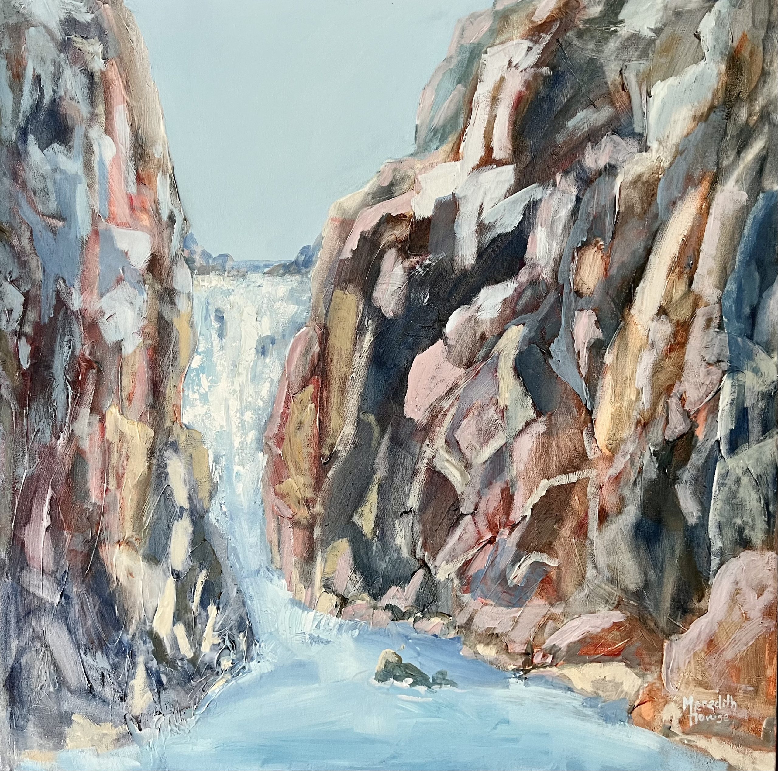 Abstract landscape with waterfall in peaceful blues, pretty pinks, pastels and golden ochres.