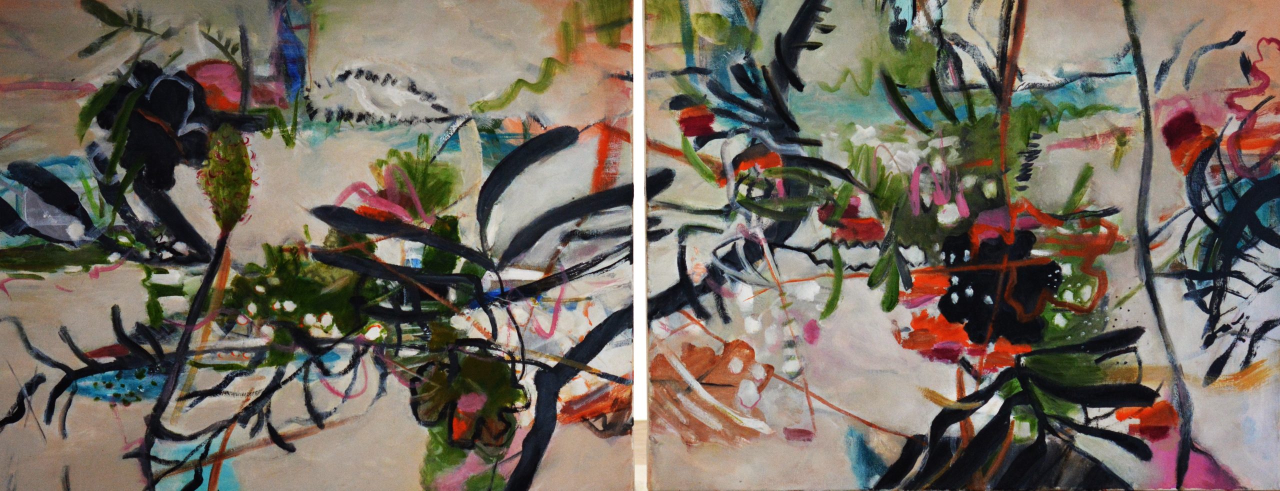 Merge and Weave by Dianne Smith is a diptych inspired by a quiet moment in a creek where plant fragments and leaves merge and weave into beautiful patterns as they gently flow along before dispersing.