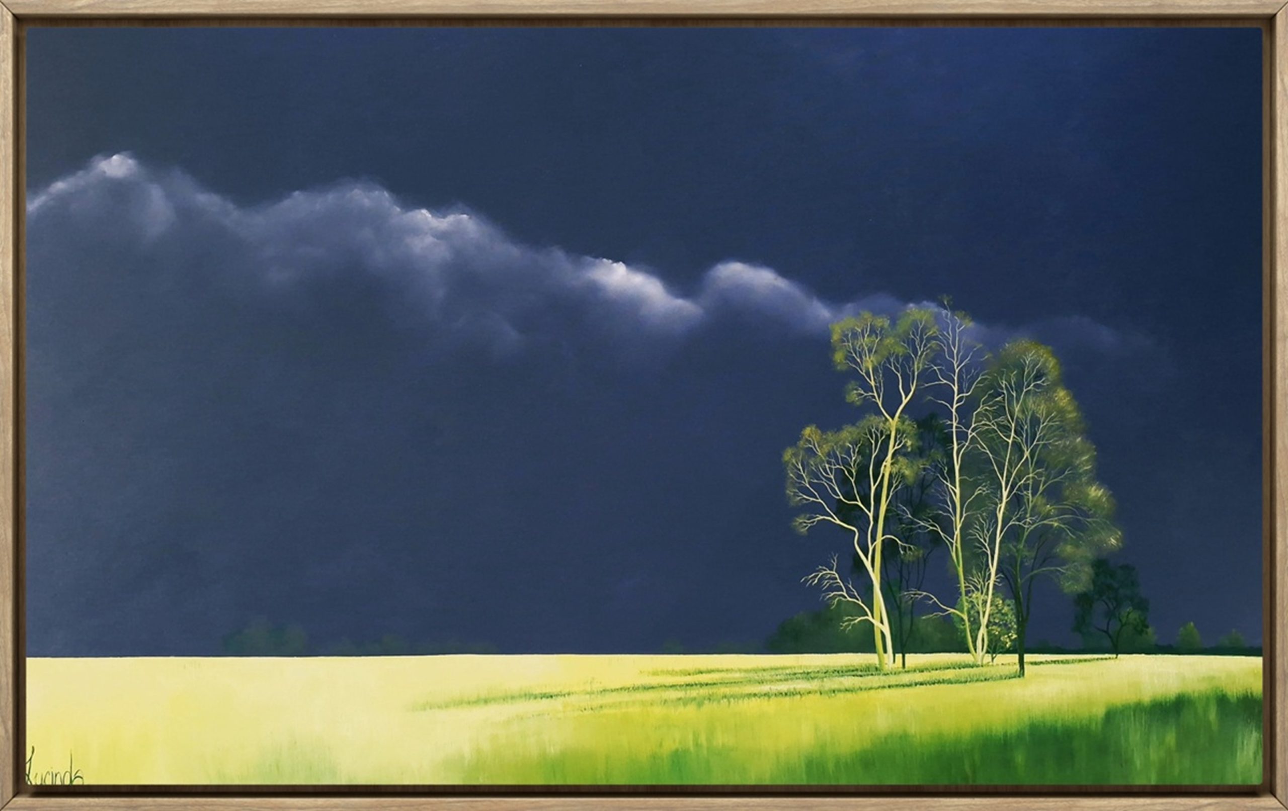 Mesmerised By You Lucinda Leveille  is set in a large landscape format, capturing an enchanting scene under a deep bluish-purple sky. Whispy clouds drift softly across the canvas, their delicate forms disguising the approaching storm, suggesting the fading light of day. The sun, though hidden behind the cloud cover, still evokes a sense of warmth and wonder, as its last radiant rays filter through, illuminating the world below with a nearly blinding brilliance.