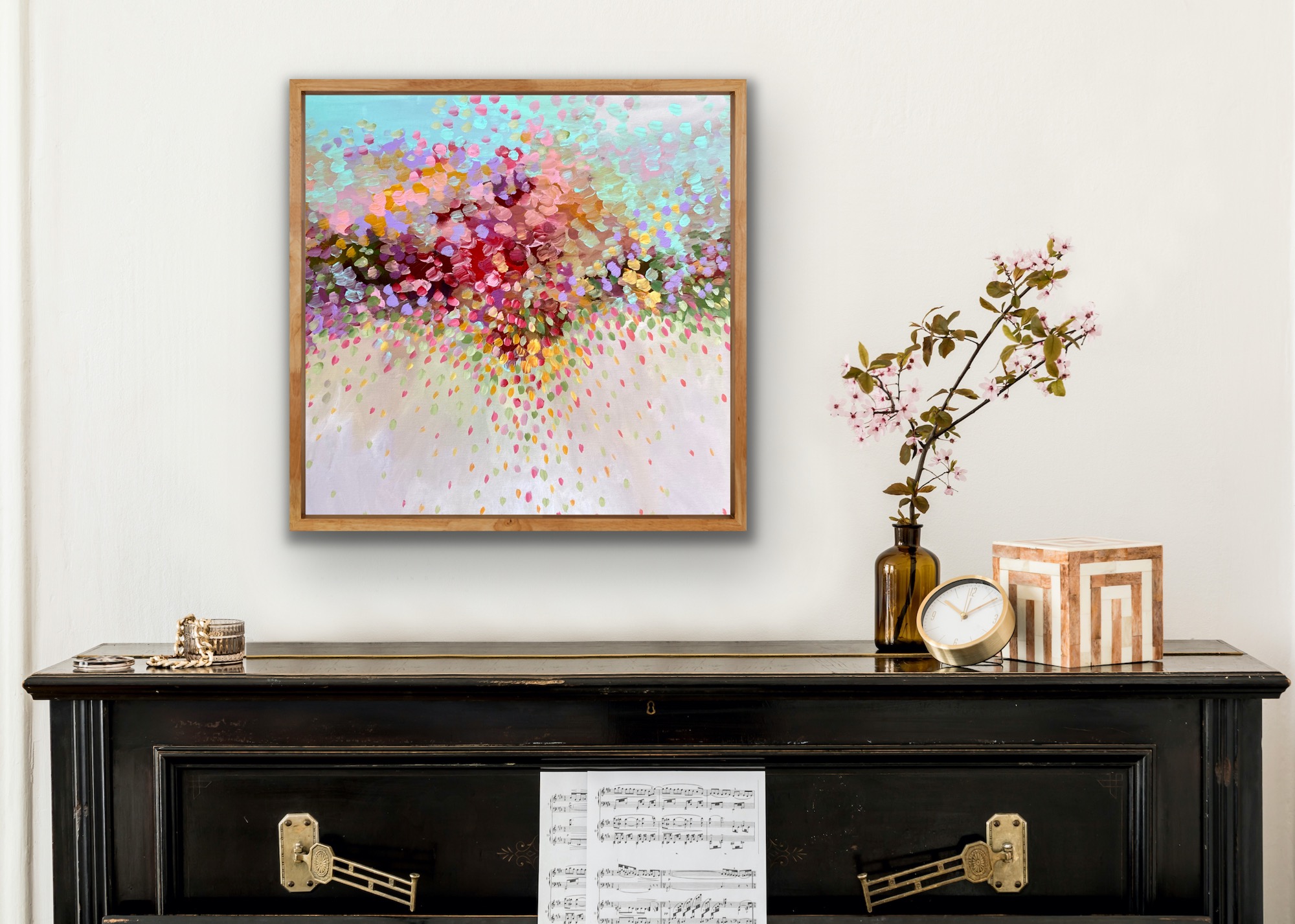 Mesmerising Beauty by Theo Papathomas is a very soothing and tranquil painting with so much depth. I wanted to have a lot of space to bring out all the beautiful colours of the forest. I tried to create this beautiful composition of soft colours of the landscape. A beautiful bouquet of petals of the forest. Capturing the beautiful colours of the petals like musical notes dancing in the landscape. A very harmonious and tranquil composition that can be enjoyed many years to come. This painting is framed with a beautiful natural wood. The painting is signed and dated 2020 at the back and comes with a certificate of Authenticity.