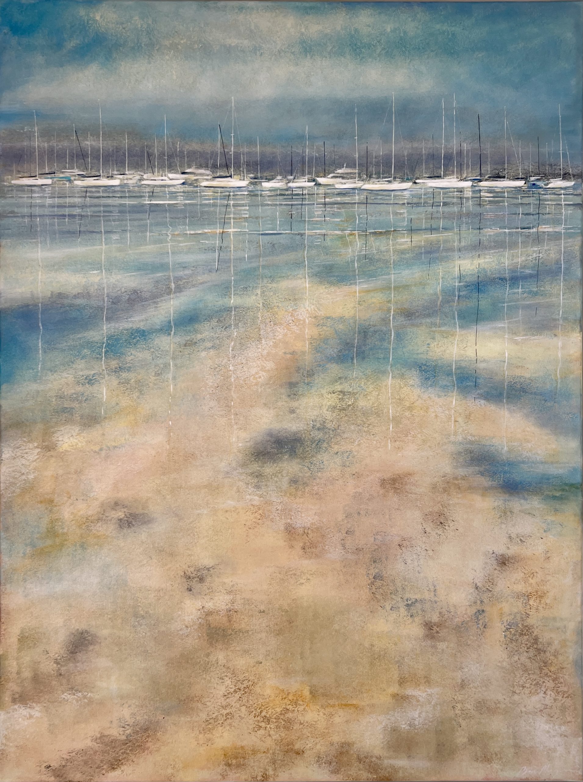 Mesmerising Moments by Ben Musgrove – Inspired by my love of the sea, sky, boats and capturing the moment. In this painting the horizon is loaded with a soft and calming purple haze and the the yacht masts reflections are dancing in the calming evening water.