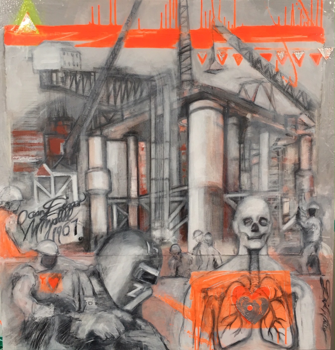 Meso Man by David White – This is a impression of a shipyard which I worked in…. The memory of the experience will always stay with me as I worked on Australia’s first Oil rig “Ocean Digger”. This was built by in Whyalla in 1967 by BHP back in the days when Australia heavy manufacturing industry. This shipyard was the university of life .This experience introduced me to trades people from all over the world. It was an amazing experience for a 17 year old boy fresh out of school which also introduced me to the world of heavy engineering. Then 40ty years after the event I have told that I have been exposed to Asbestos through this experience … hence ‘MESO man’