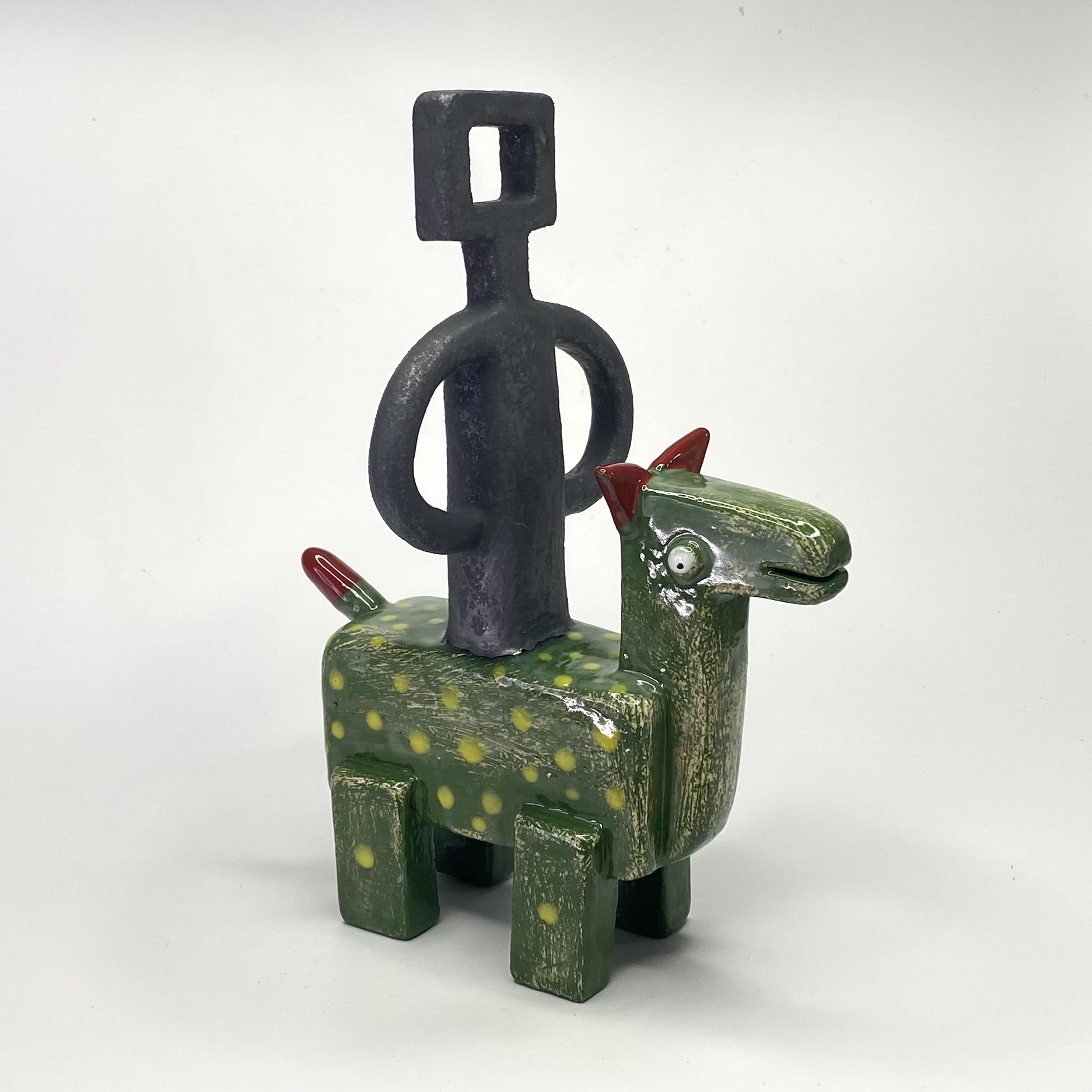 Metallic Ned Kelly on his horse – By Stefan Mager – Inspired by Sydney Nolan’s Ned Kelly design. The ceramic , copper oxide Ned Kelly riding a green oxide horse with yellow dots and red ears.