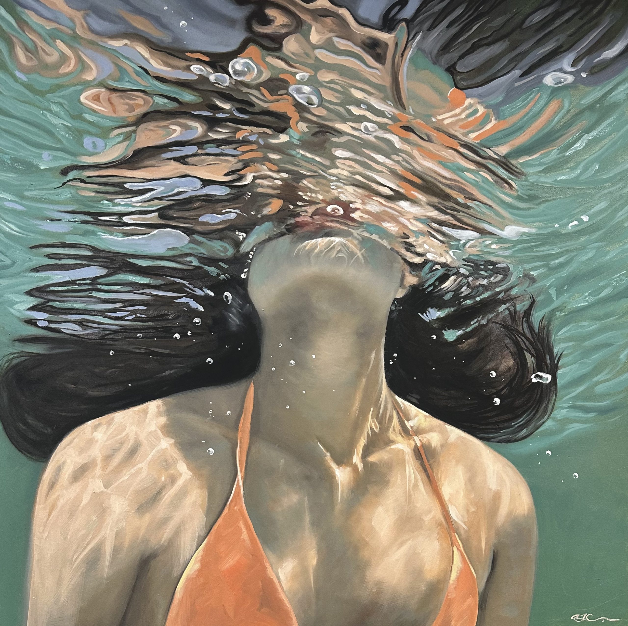 Metamorphosis by Amanda Cameron – is one of a new series called ‘Salt Water’. While still exploring the interaction and connection between water, light and form, this series also analyses the sense of disquiet when swimming in deep ocean water. At the same time, the main focus is the quest for refuge, quietness and escapism. These paintings juxtapose the lone swimmer and a few minutes of introspection when alone in deep water against the fear of the unknown. The constant struggle between hyper-realism and having a painterly quality to my work is a conflict that I am always trying to balance; therefore, thick paint and evident brush strokes are present when viewed up close. This piece is painted in professional oil paints on a museum-quality canvas and finished with edges painted and varnish for protection. It comes ready to hang and includes a certificate of authenticity.