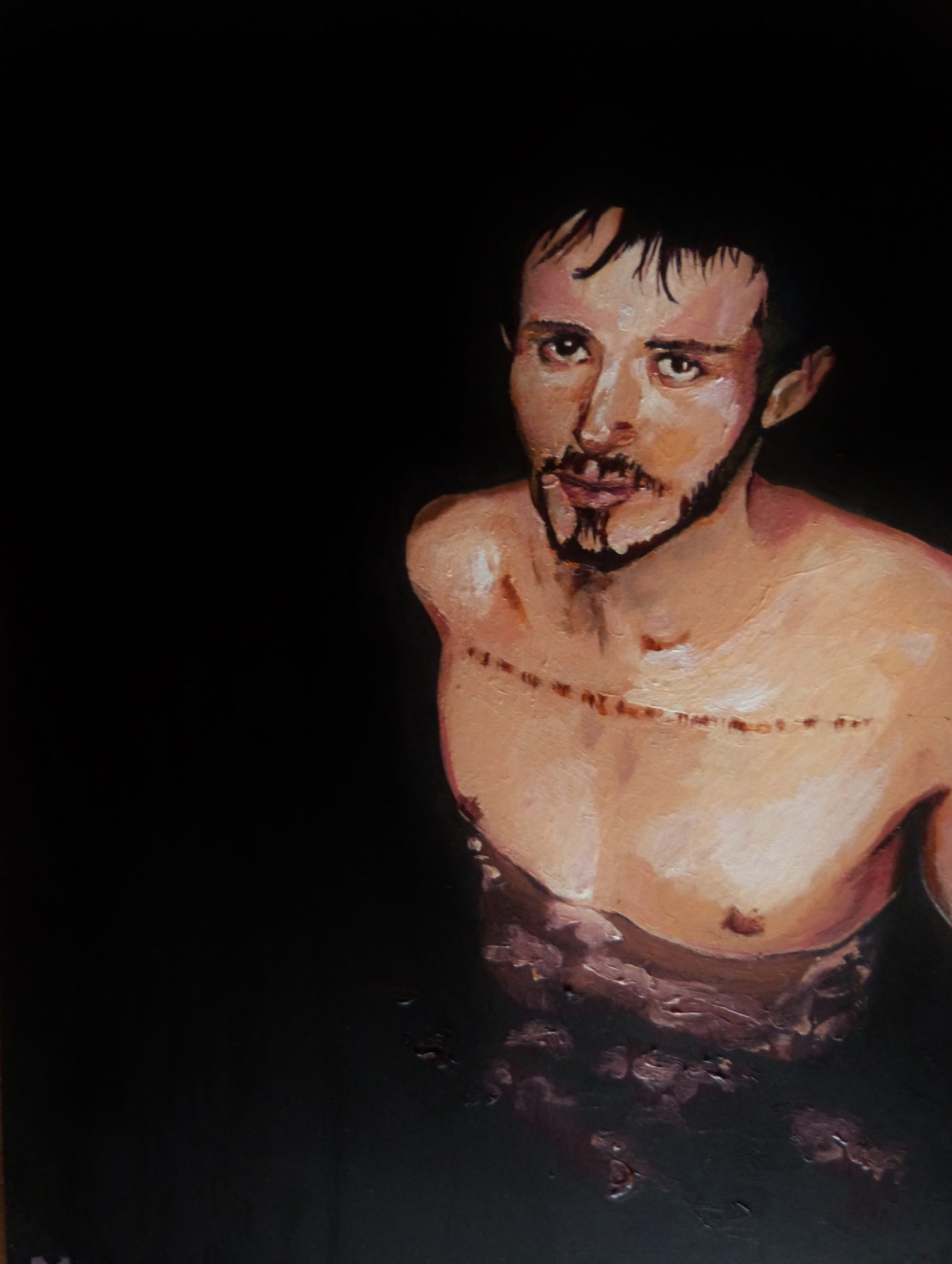 This a portrait of a young writer. It is evocative of the narrative where something always happens at midnight, and of course somewhere isolated. The writer finds himself as one of his characters caught in the headlight, perhaps, of an unknown driver’s vehicle.