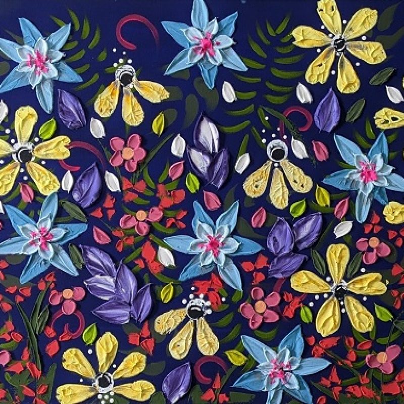 A captivating dance of blue hues and delicate floral forms, this abstract painting evokes a sense of serenity and movement. Hints of lighter tones add depth and contrast bringing a luminous quality to this piece.